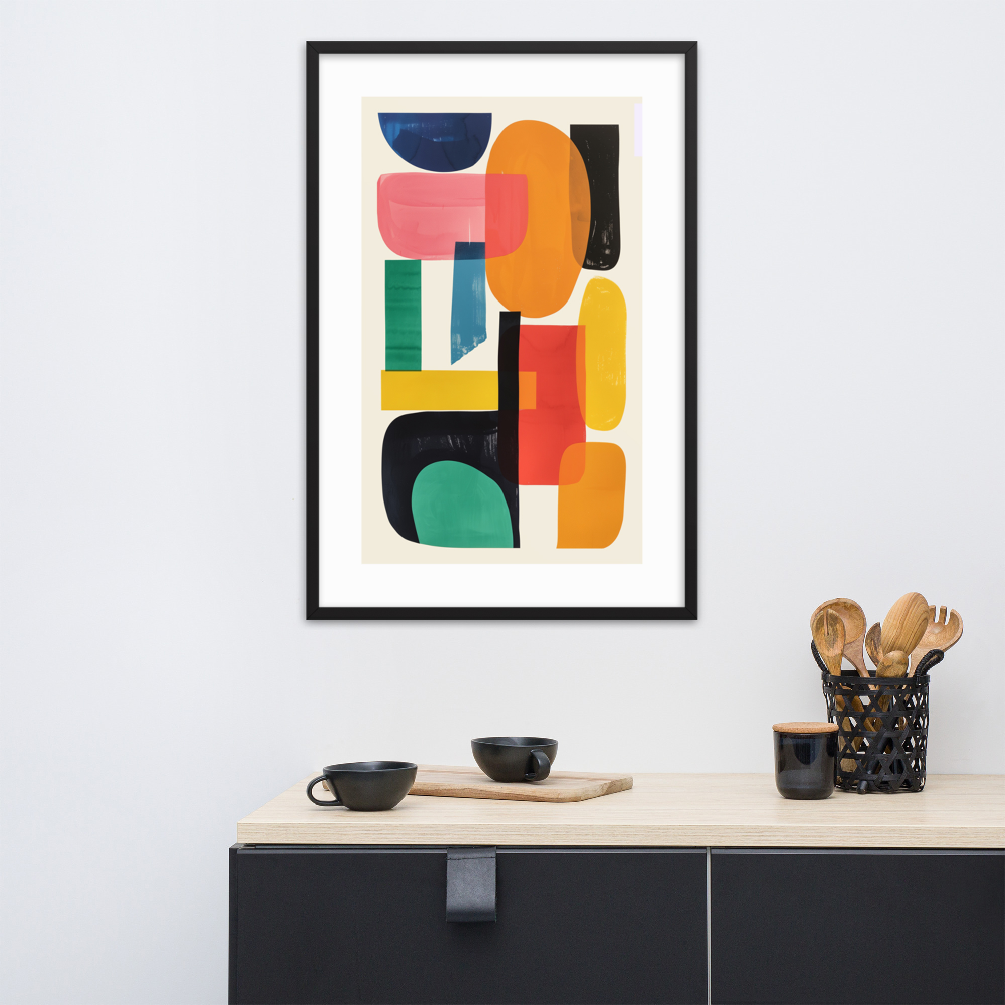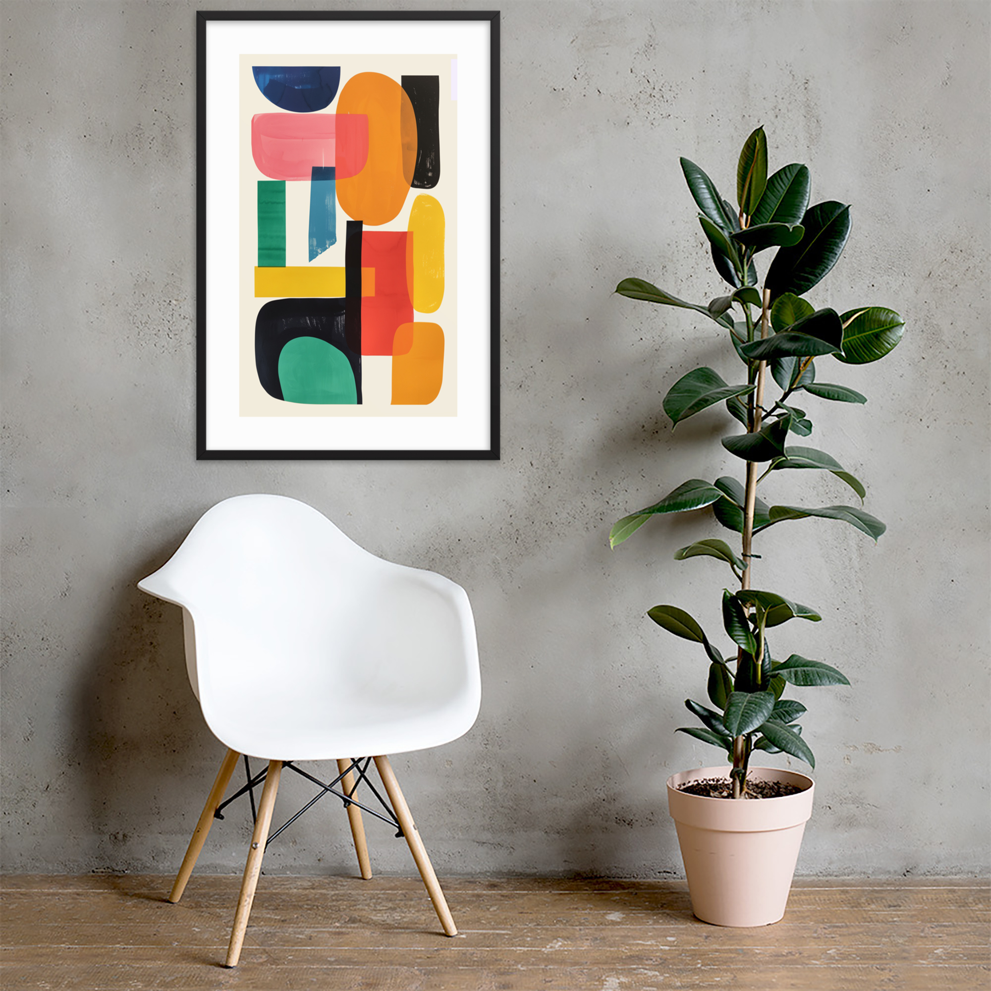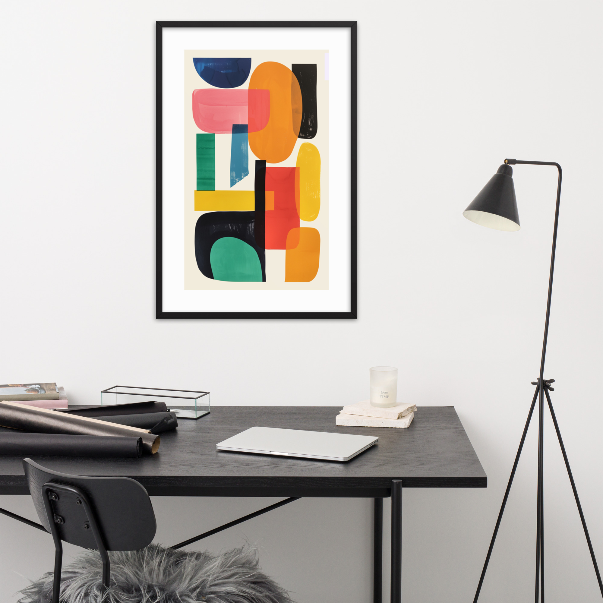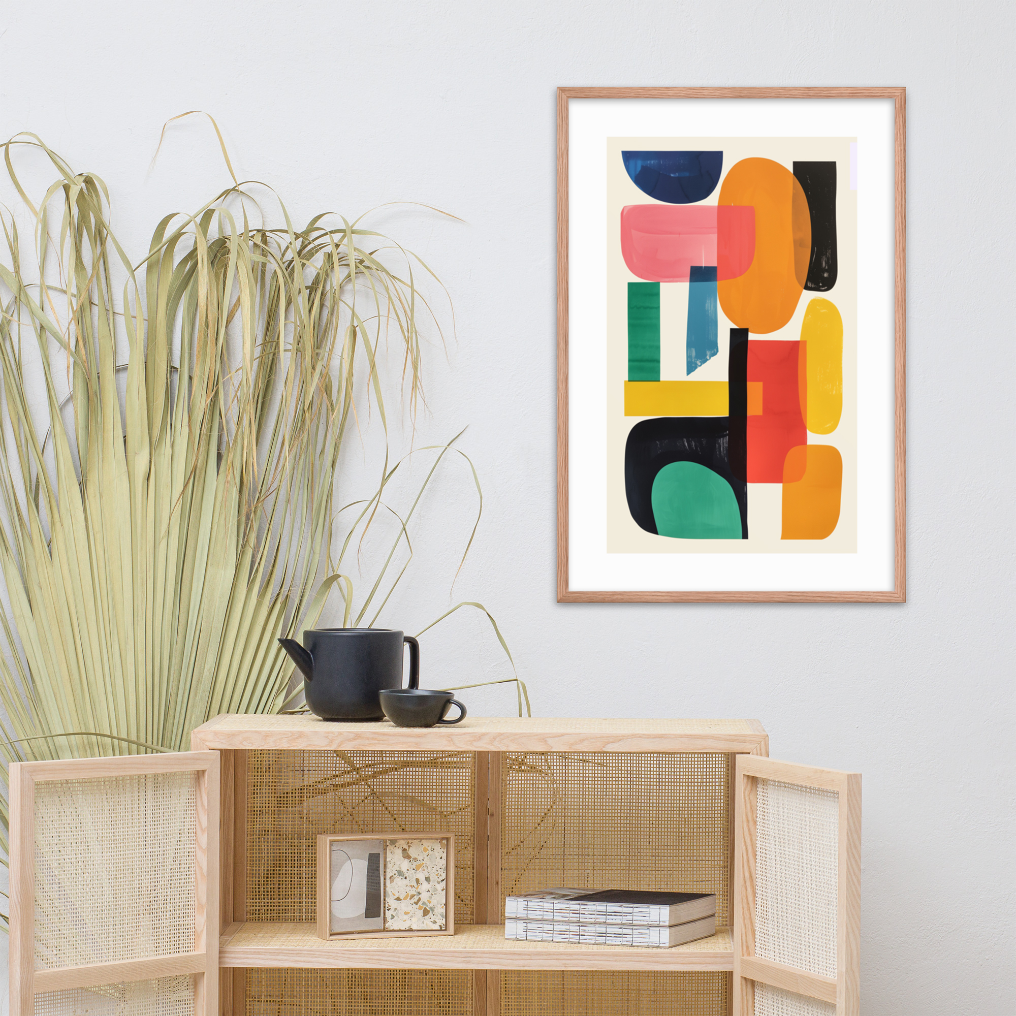 This abstract geometric art print features colorful shapes arranged in a modern design. Inspired by mid-century aesthetics, it’s perfect for fans of bold, artistic decor. Hang it in your living room, office, or bedroom to add visual interest and energy to your space.