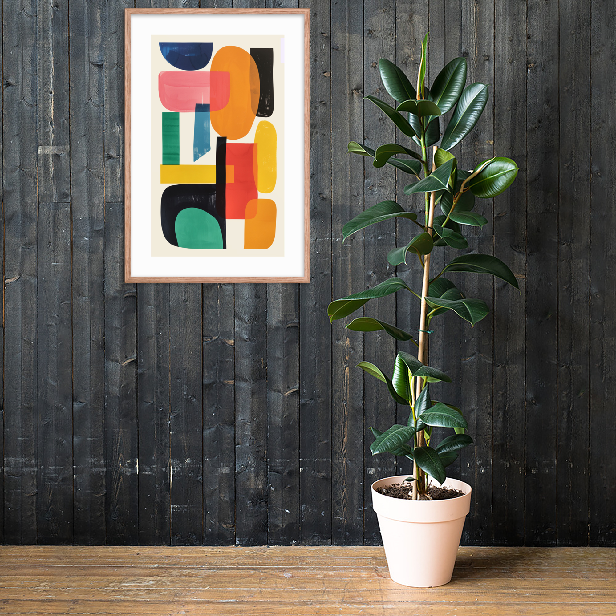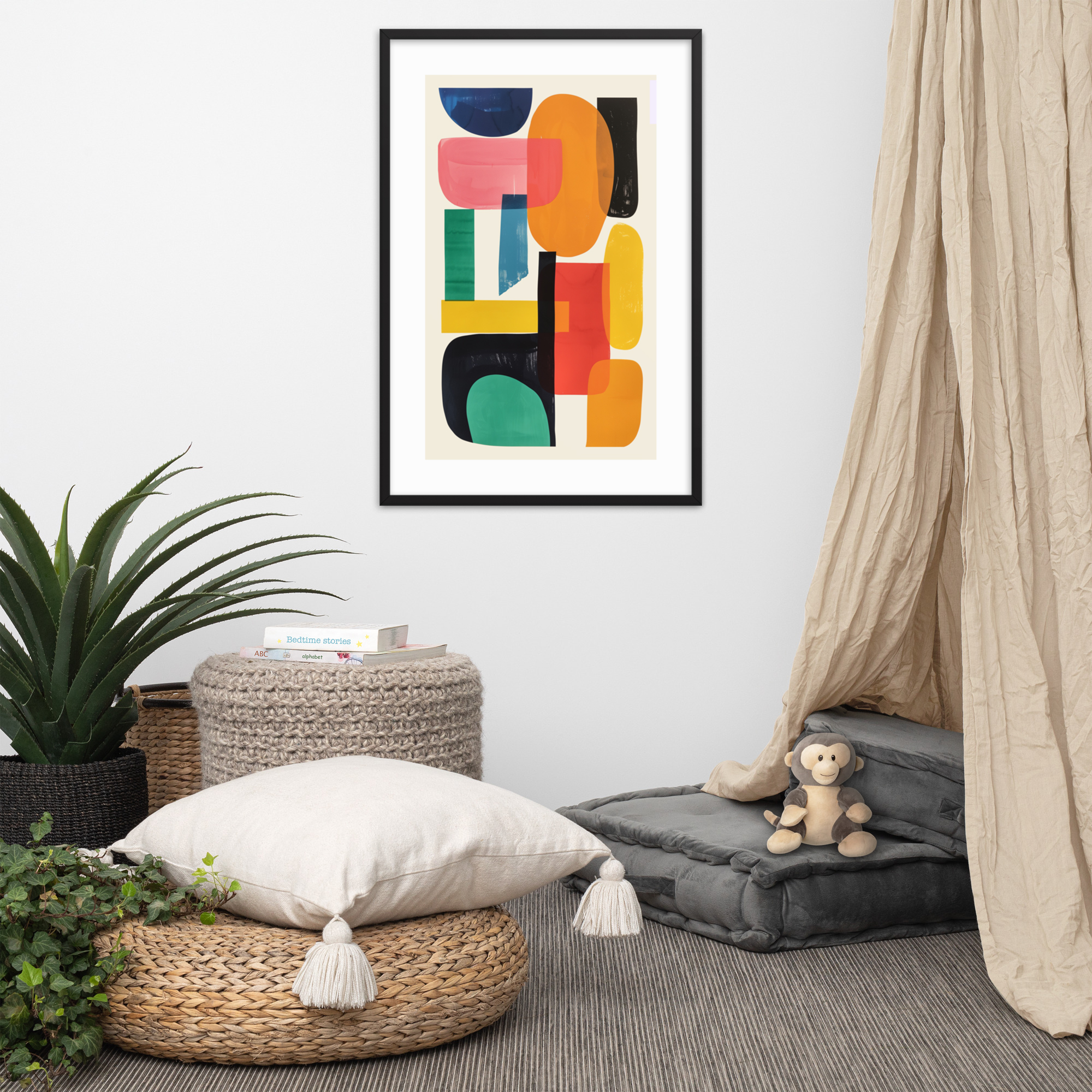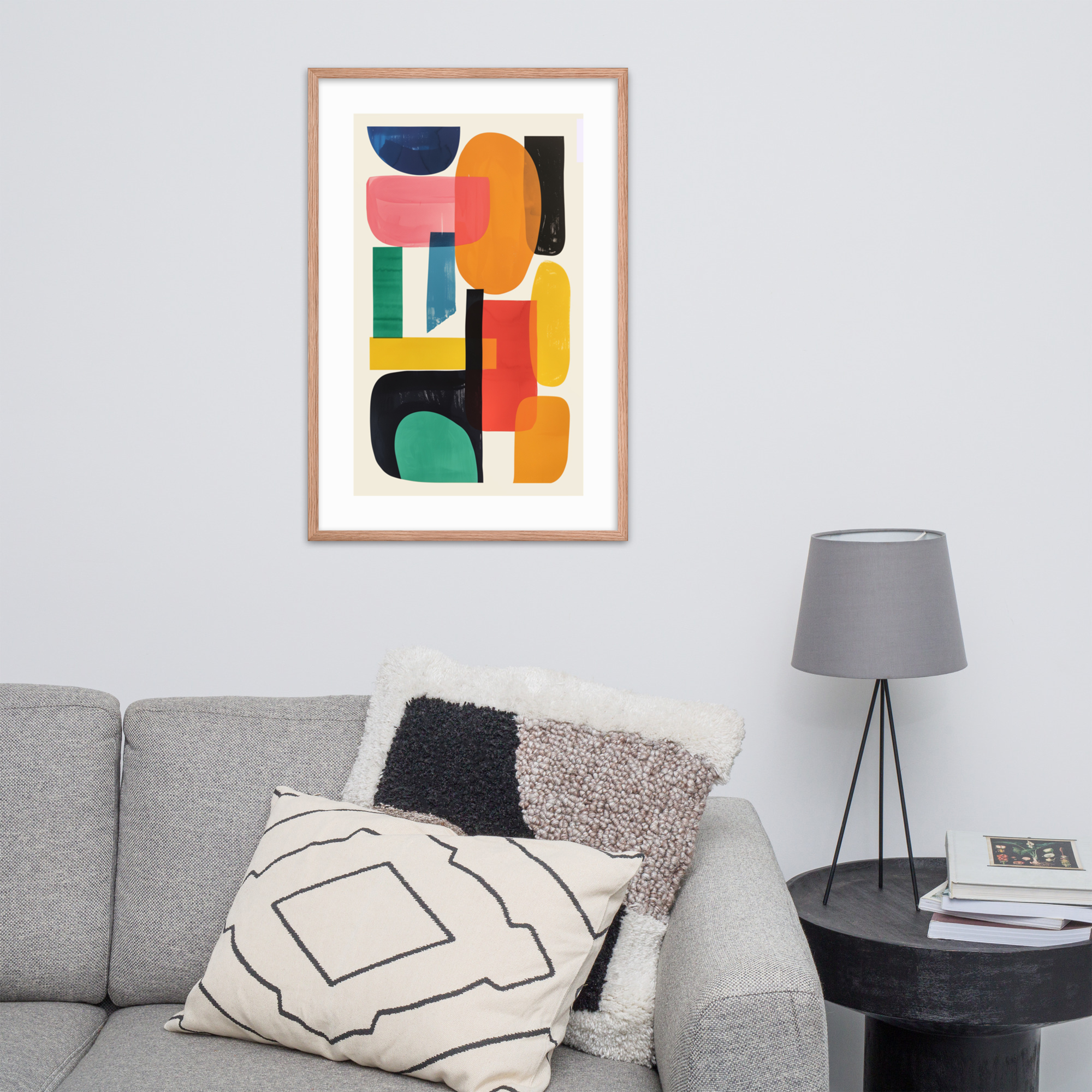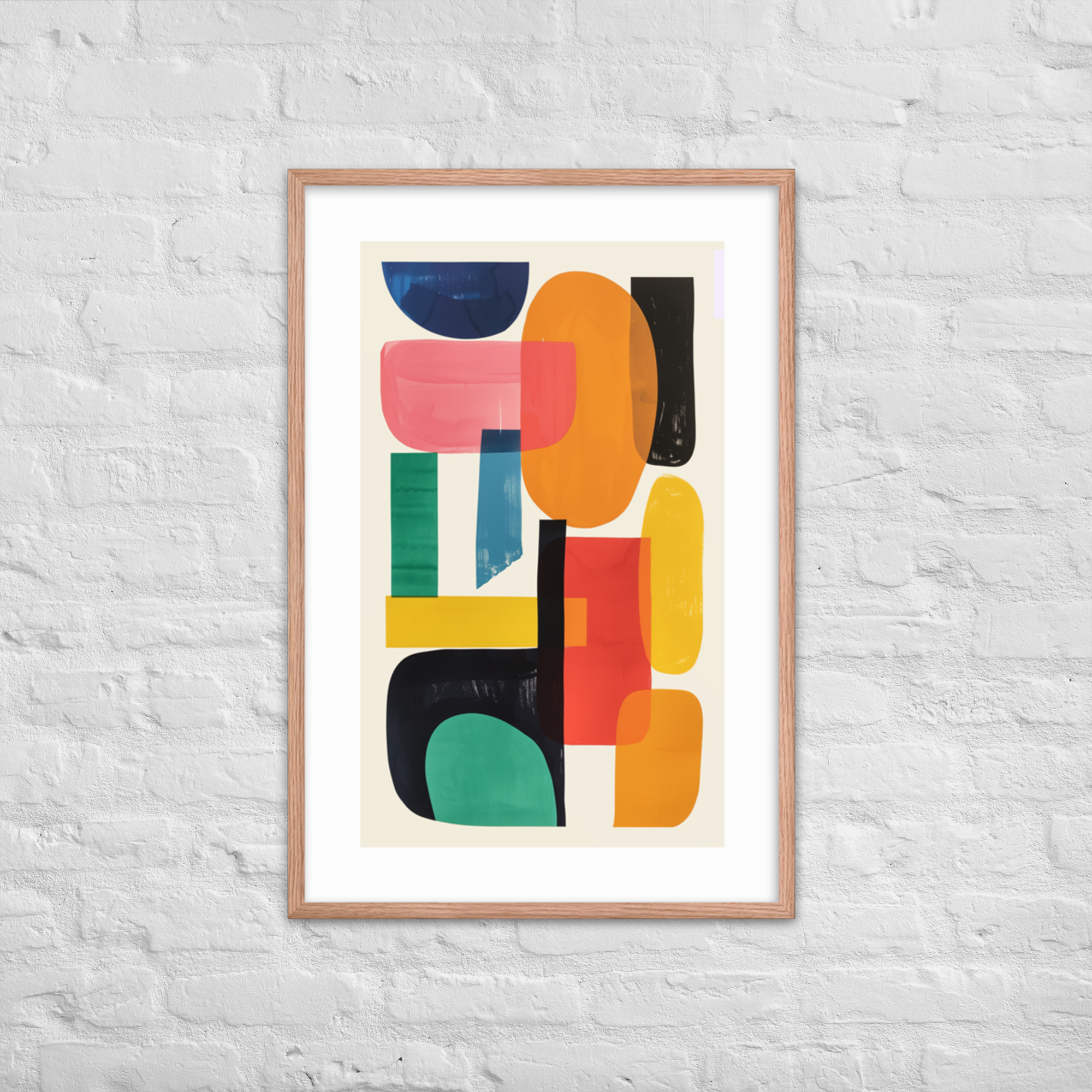 This abstract geometric art print features colorful shapes arranged in a modern design. Inspired by mid-century aesthetics, it’s perfect for fans of bold, artistic decor. Hang it in your living room, office, or bedroom to add visual interest and energy to your space.