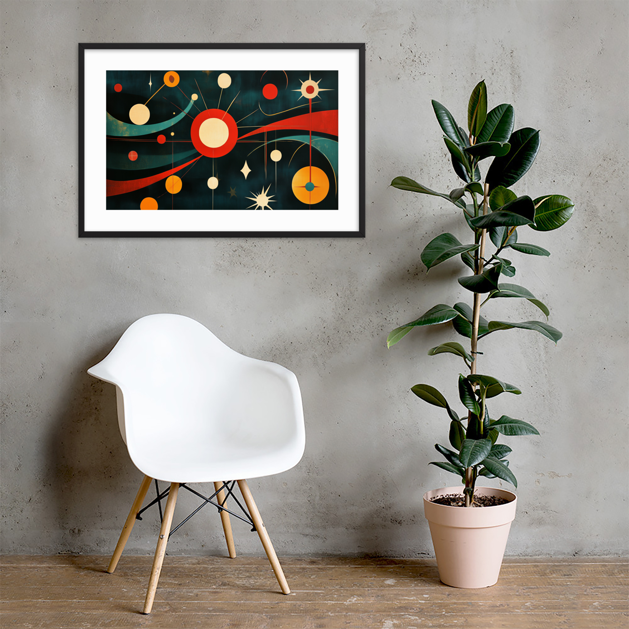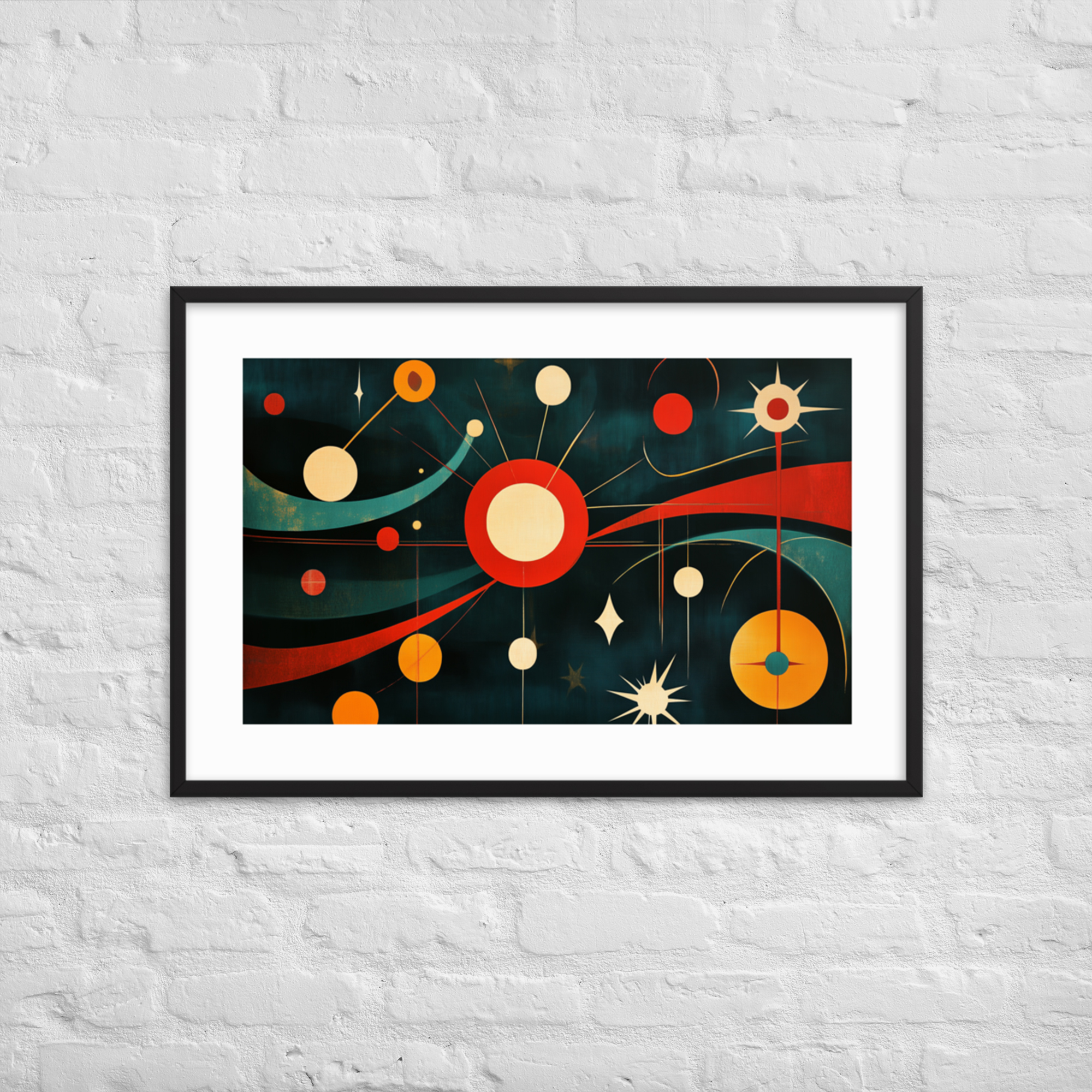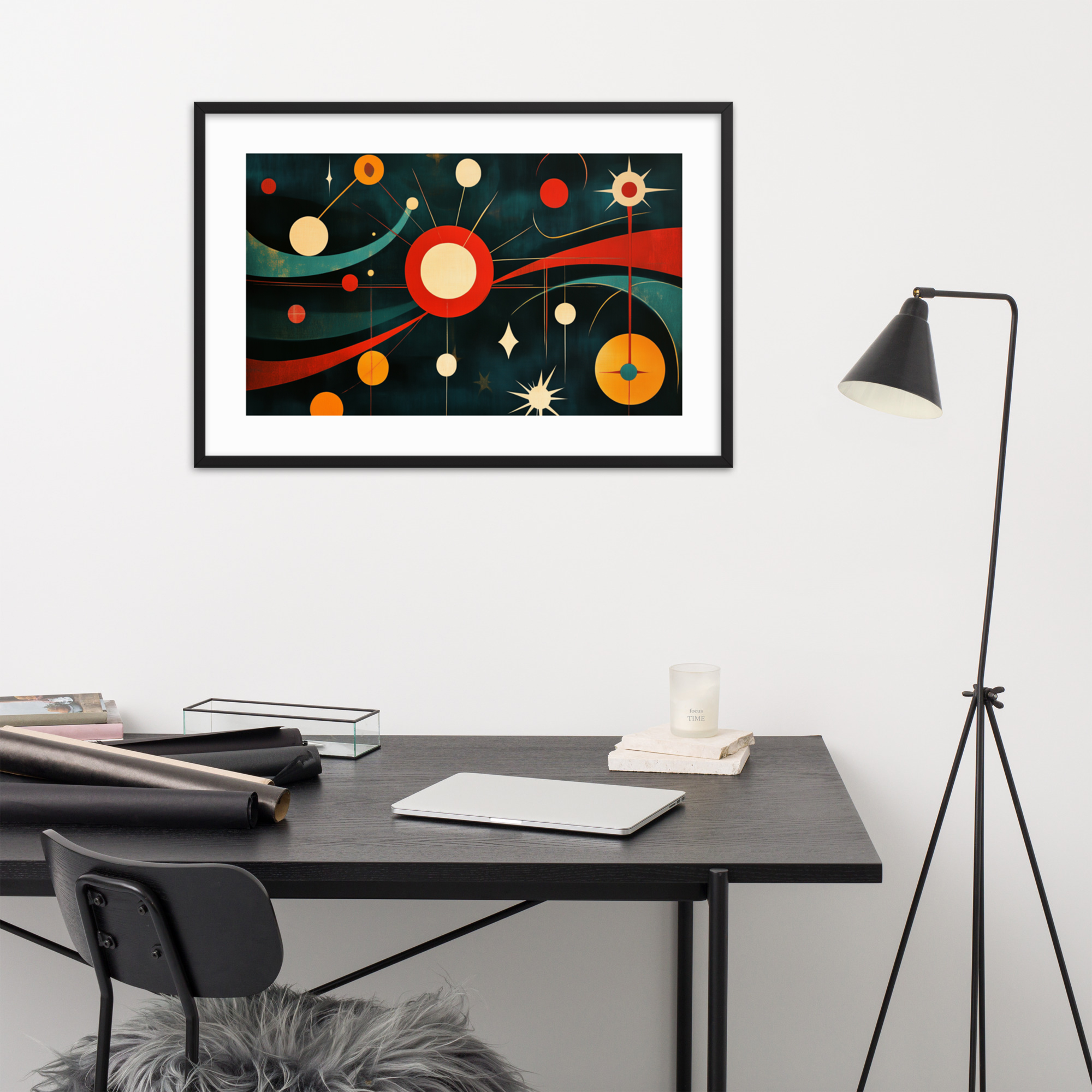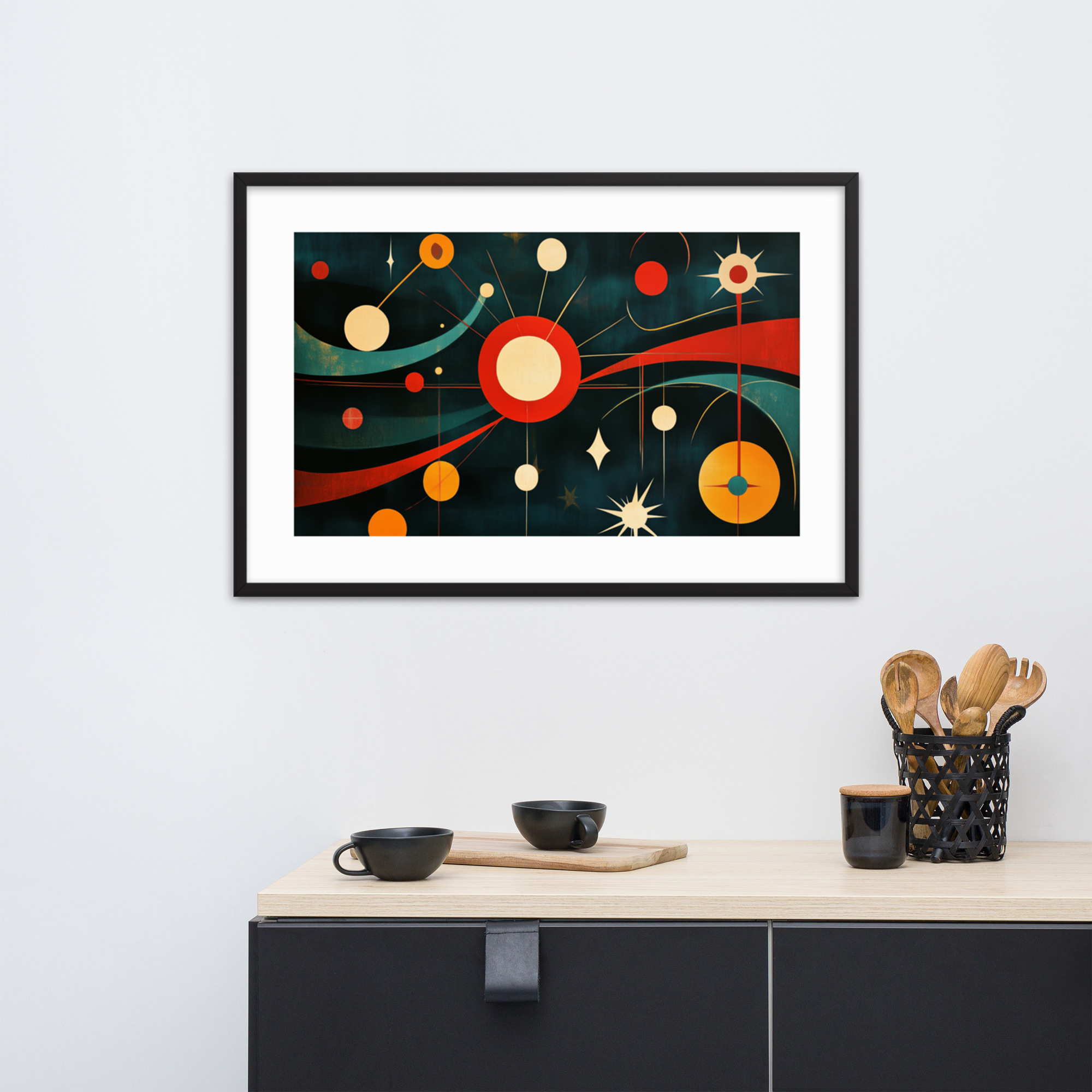 Discover the enchanting allure of mid-century geometric art with this captivating piece. Featuring bold reds, yellows, and oranges contrasting with deep teals on a black background, this artwork brings a sense of energy and sophistication to your walls. The interplay of circles and lines creates a unique, abstract look that is both retro and timeless. Ideal for adding a pop of color to any space, this piece serves as a stunning focal point.