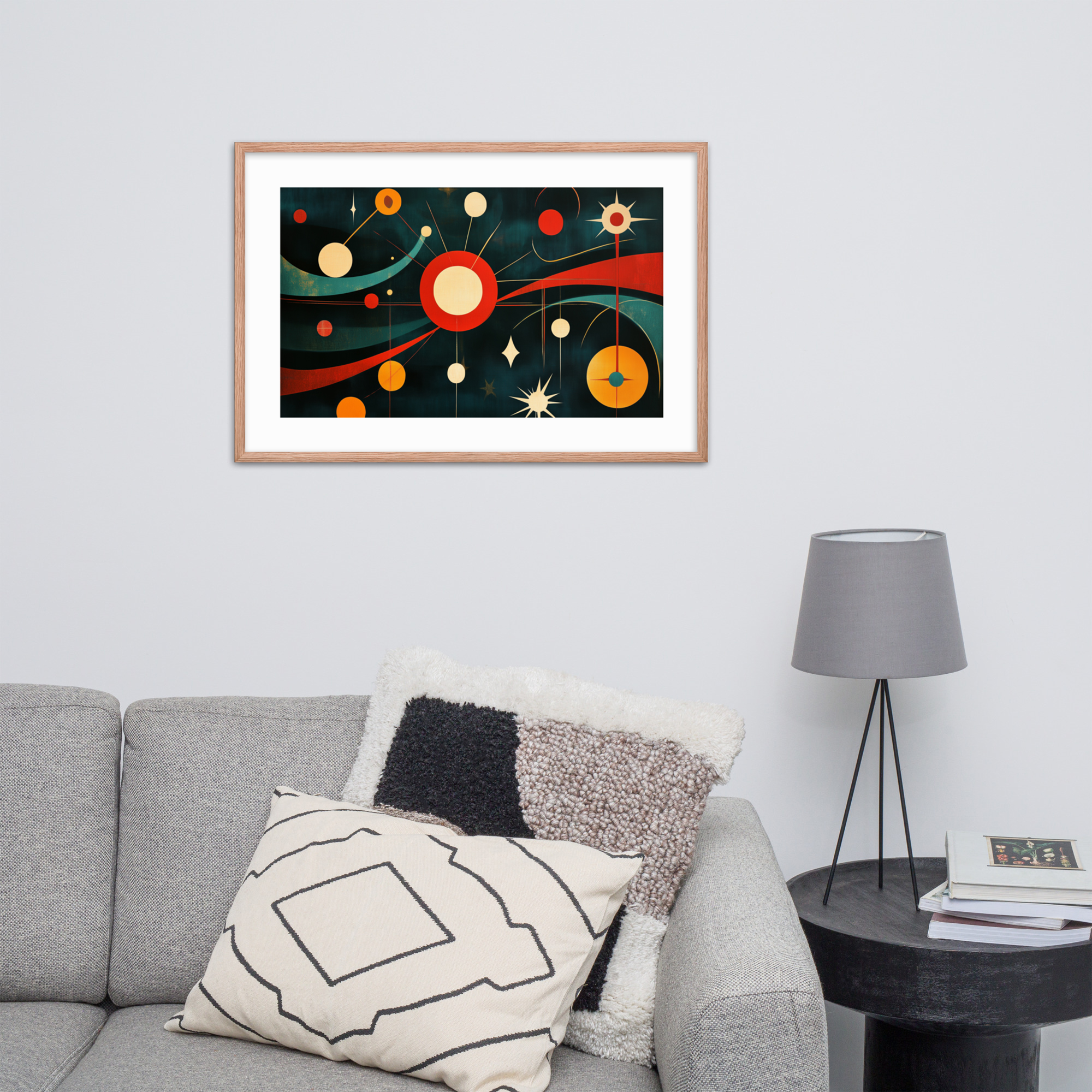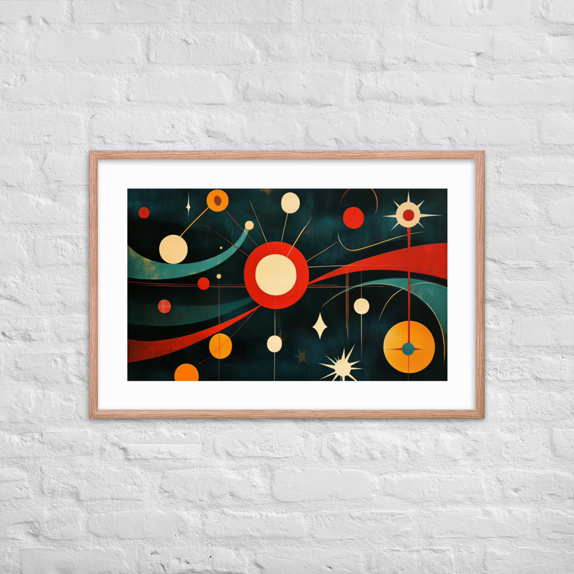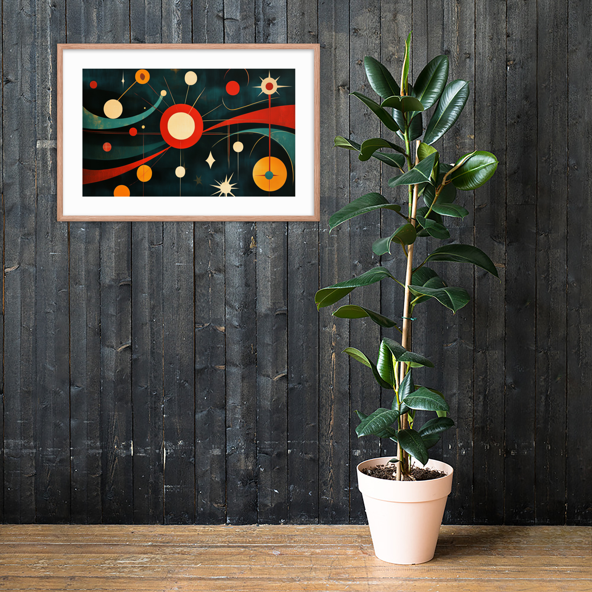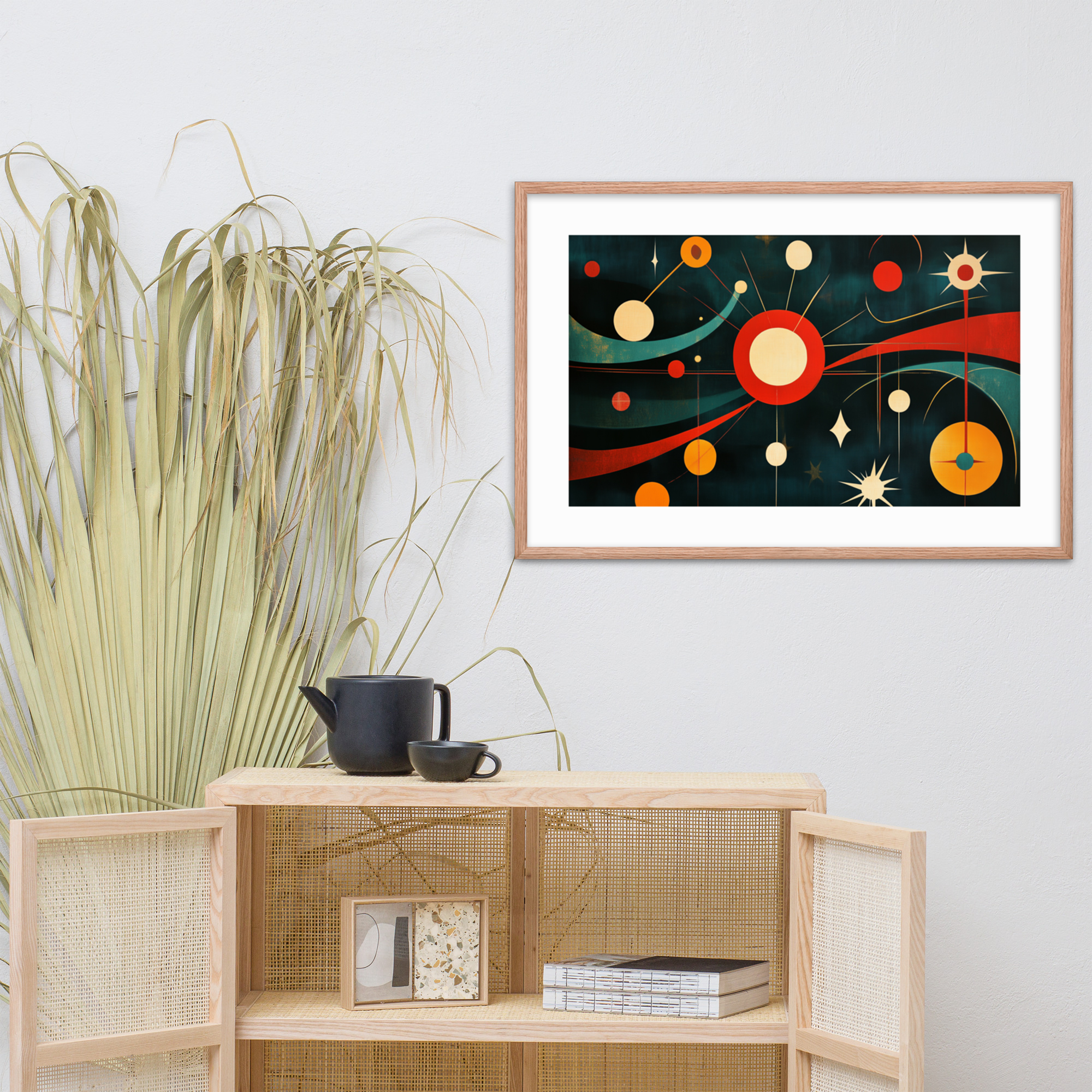 Discover the enchanting allure of mid-century geometric art with this captivating piece. Featuring bold reds, yellows, and oranges contrasting with deep teals on a black background, this artwork brings a sense of energy and sophistication to your walls. The interplay of circles and lines creates a unique, abstract look that is both retro and timeless. Ideal for adding a pop of color to any space, this piece serves as a stunning focal point.