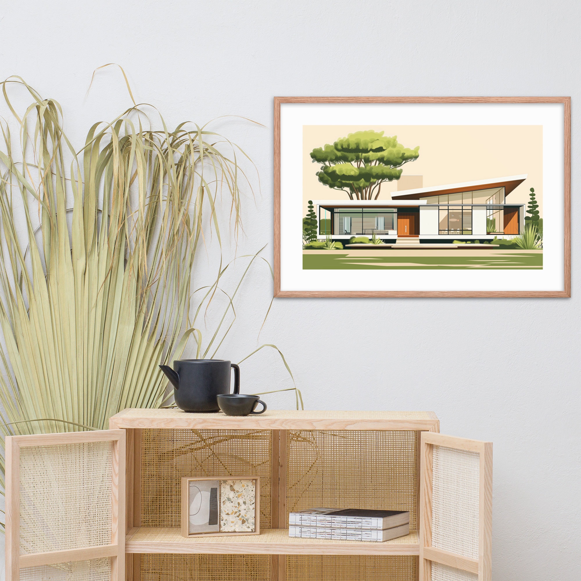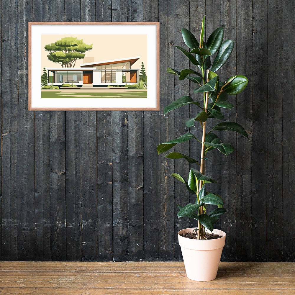 Transport yourself to a verdant mid-century paradise with this captivating print. Featuring a low-slung modernist home nestled among vibrant greenery, this artwork embodies the harmonious blend of nature and architecture that defined the era. Ideal for bringing retro charm to any room.