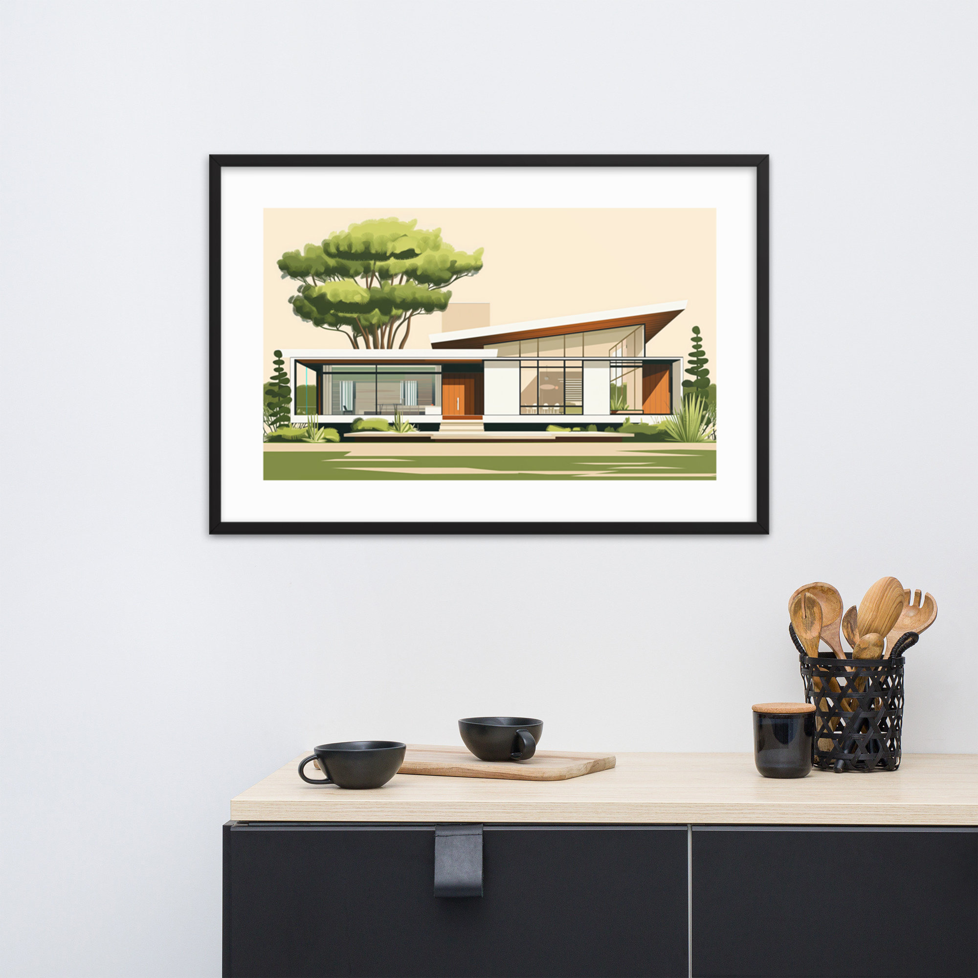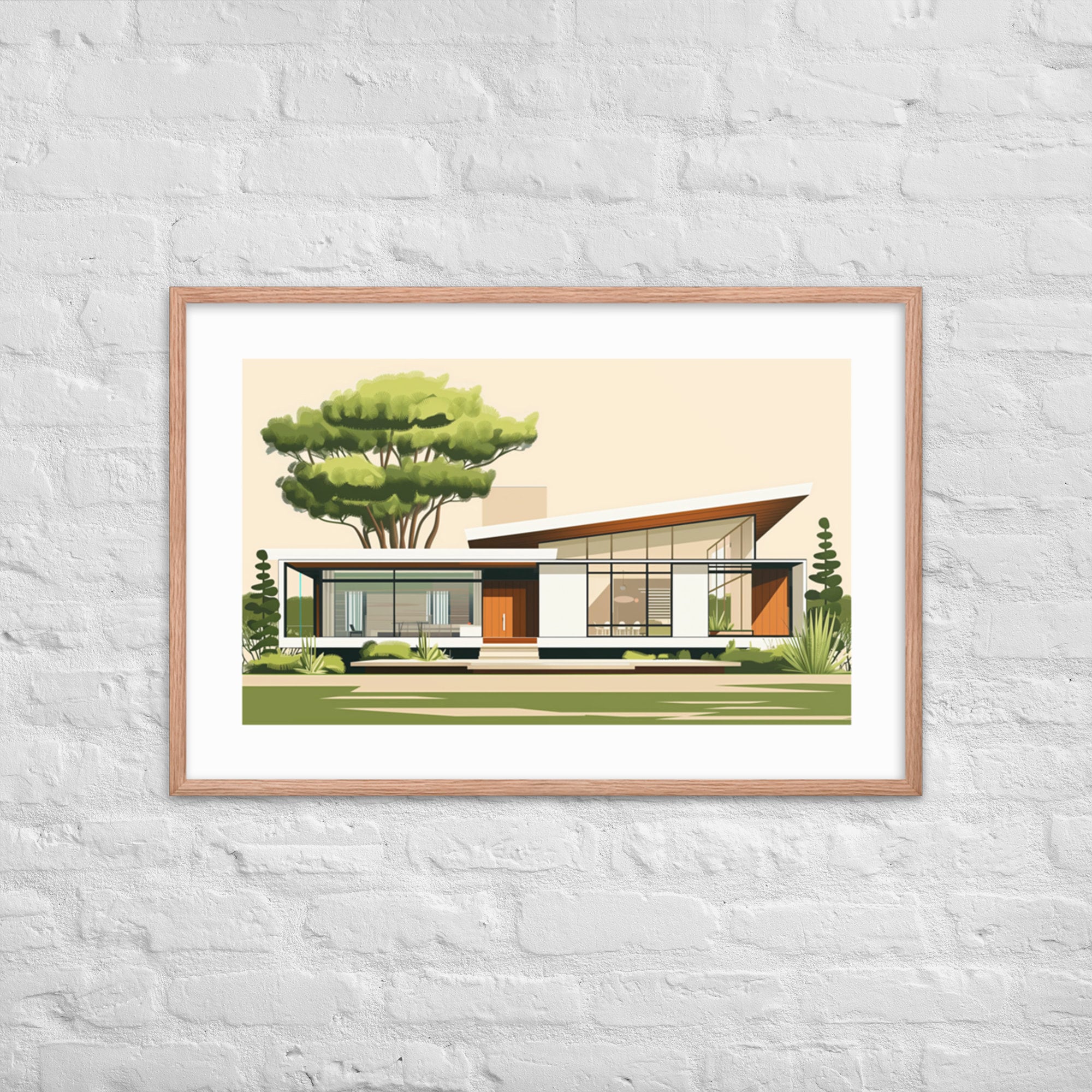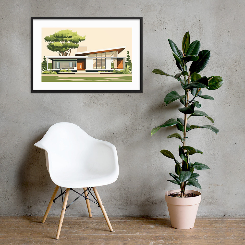This mid-century house illustration features clean lines and modern design, perfect for fans of architecture. It adds elegance and sophistication to any room, making it ideal for living rooms, offices, and bedrooms.