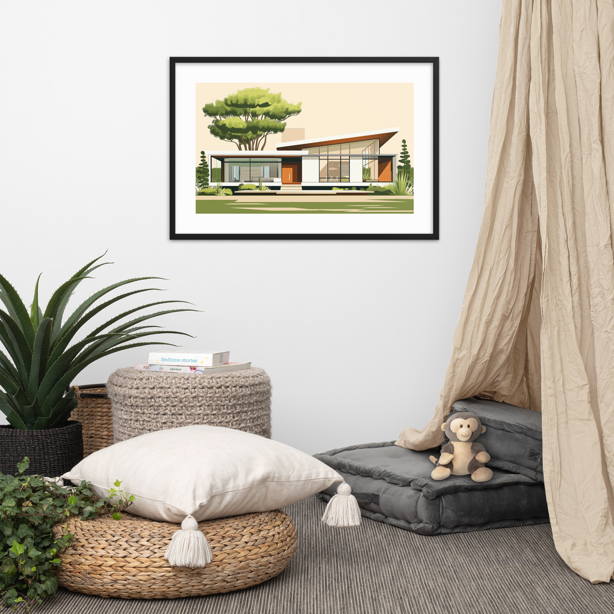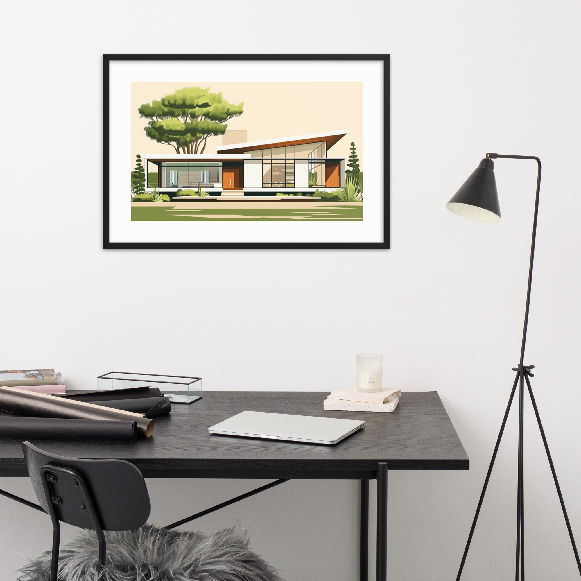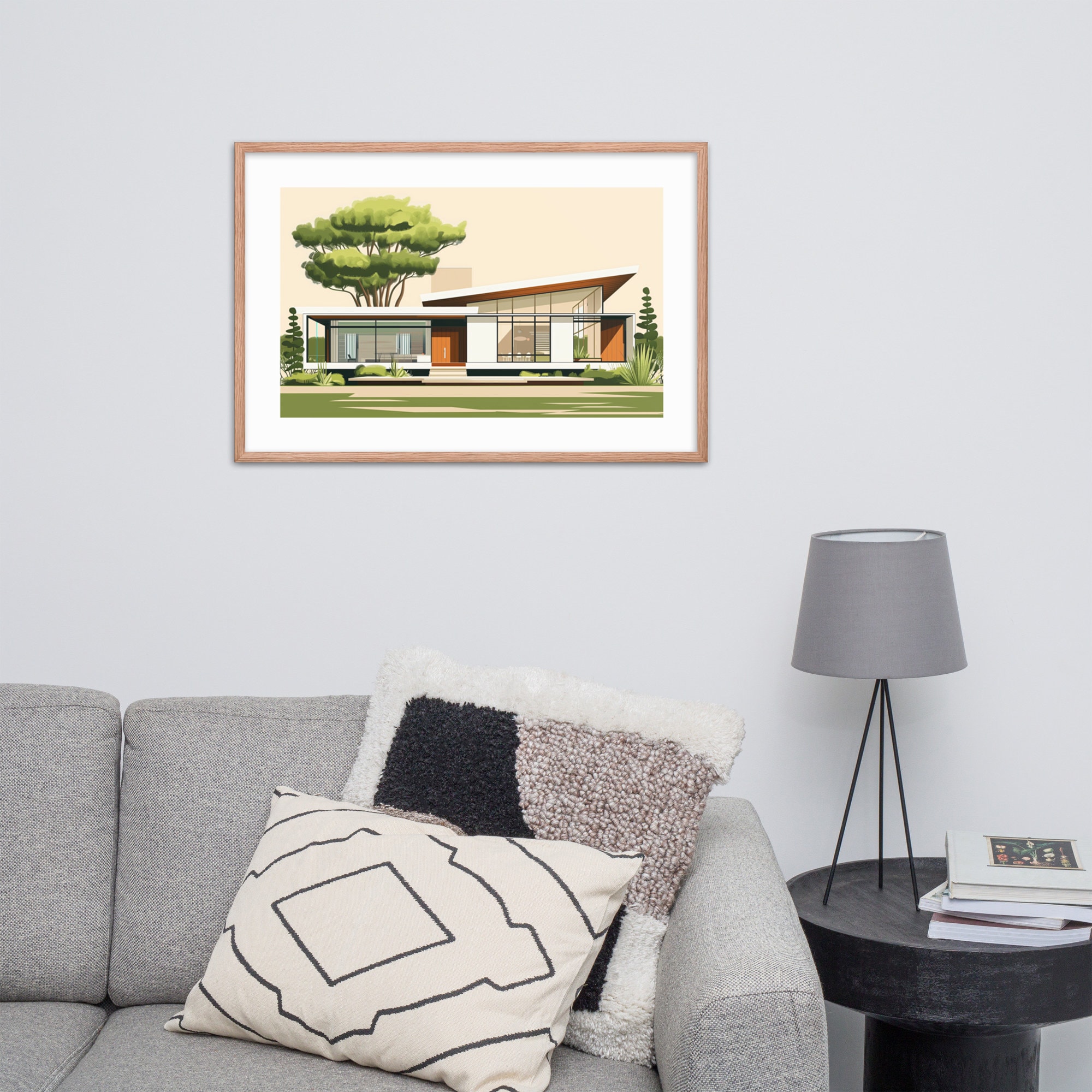 This mid-century house illustration features clean lines and modern design, perfect for fans of architecture. It adds elegance and sophistication to any room, making it ideal for living rooms, offices, and bedrooms.