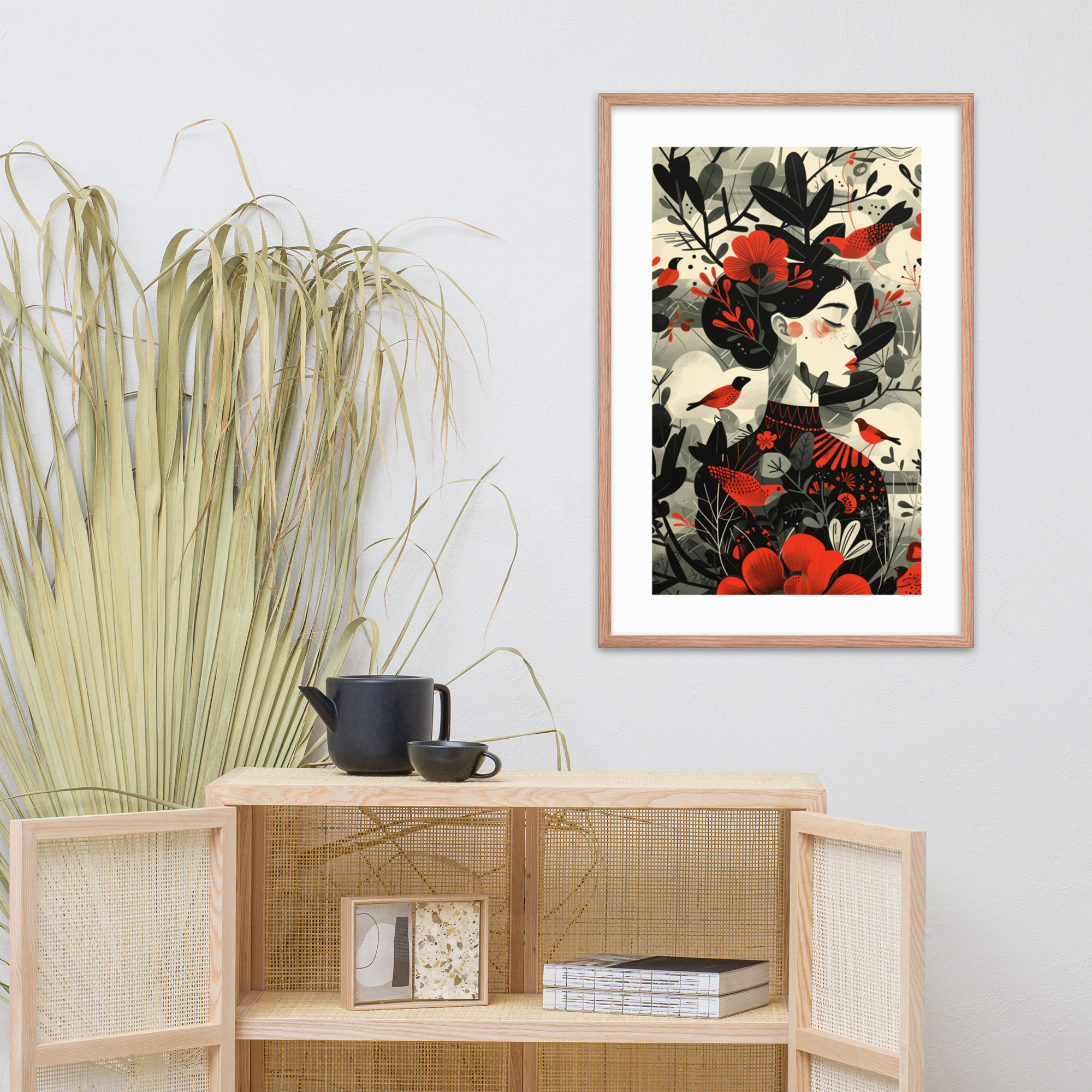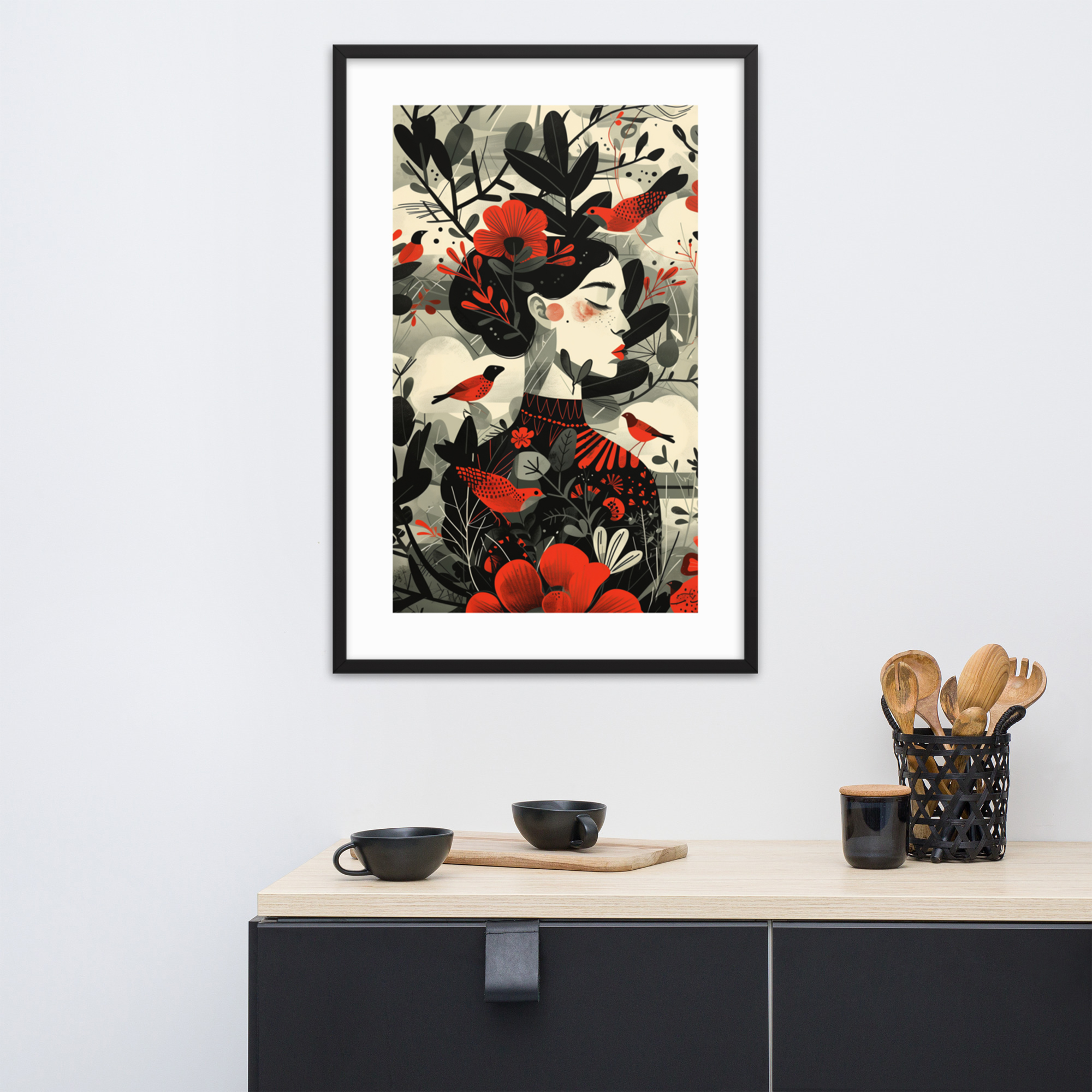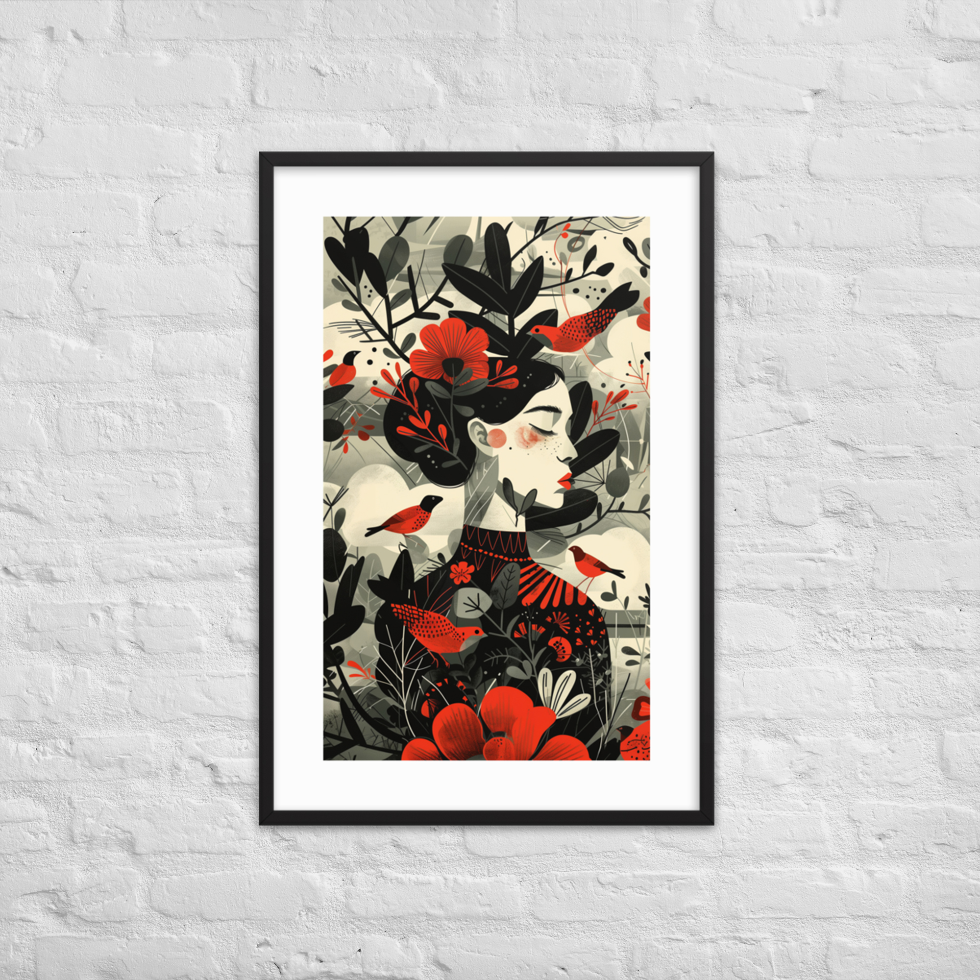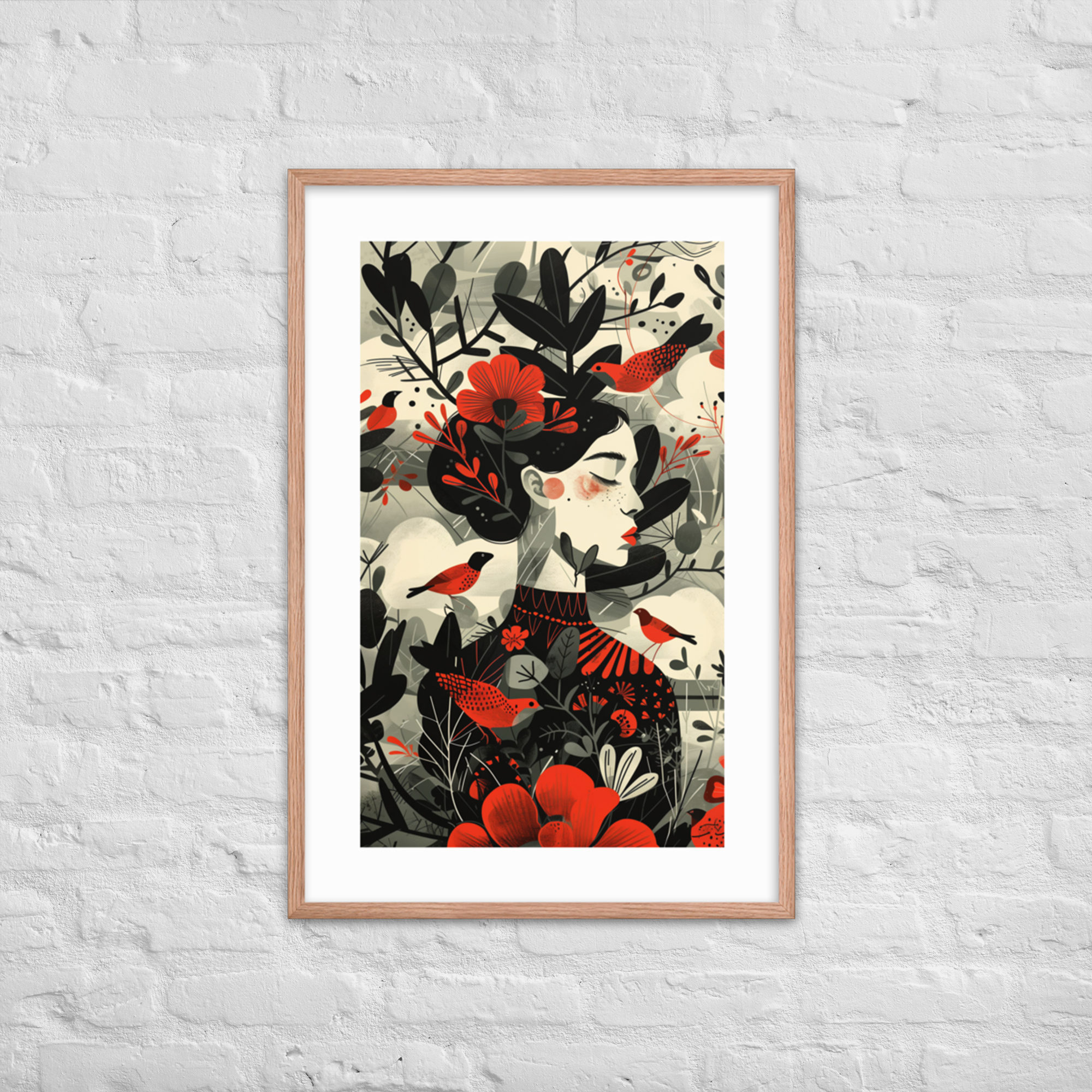 This enchanting piece captures the essence of nature with a beautifully stylized woman adorned by vibrant red flowers and whimsical birds. The minimalist frame and muted background highlight the intricate design, making it a perfect addition to any living space. Enhance your decor with this unique artwork that brings a touch of nature indoors.