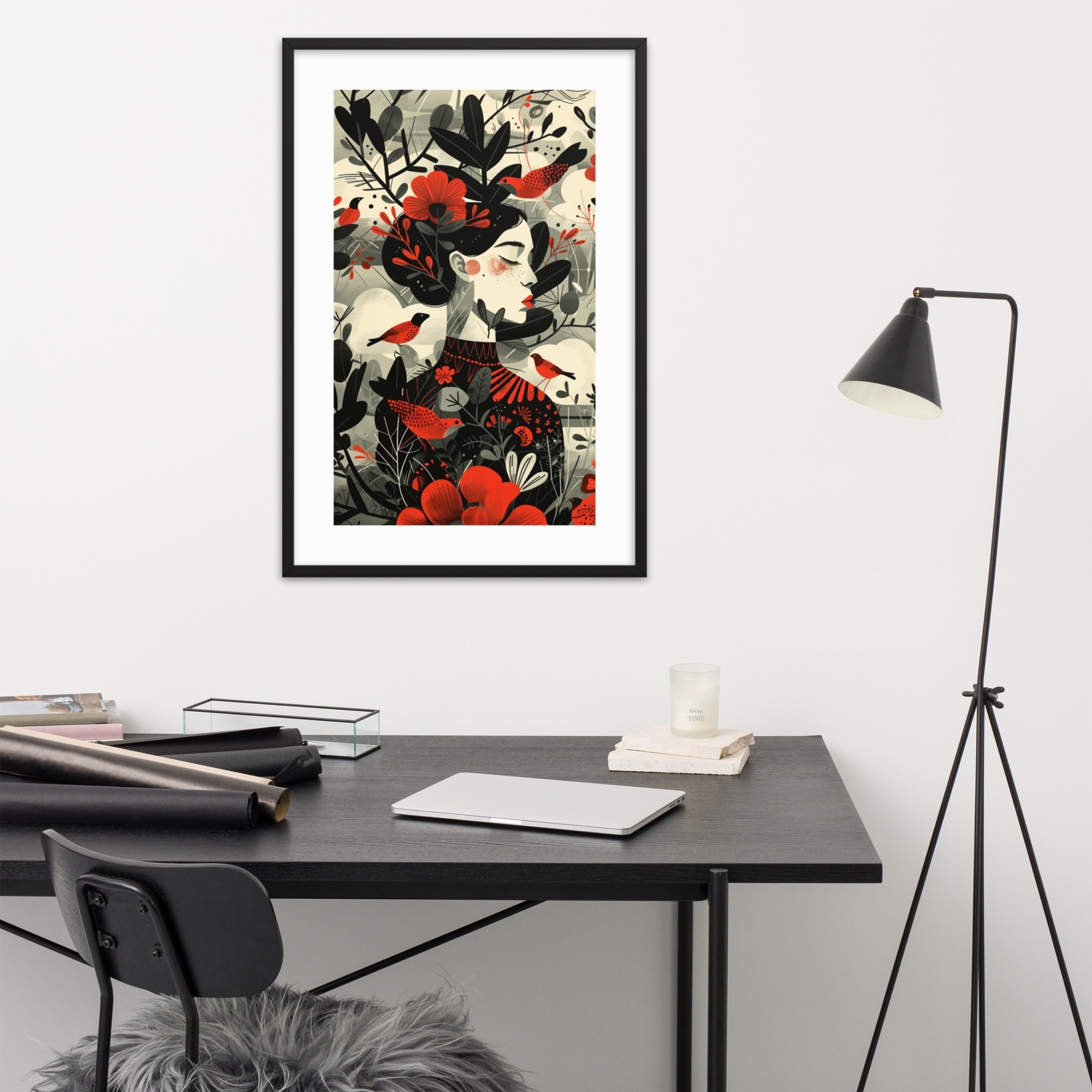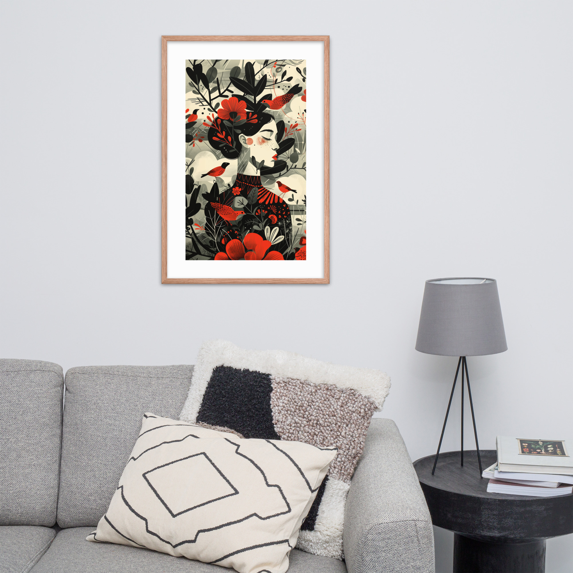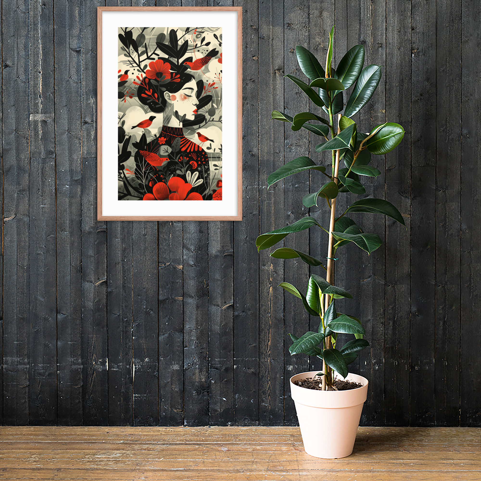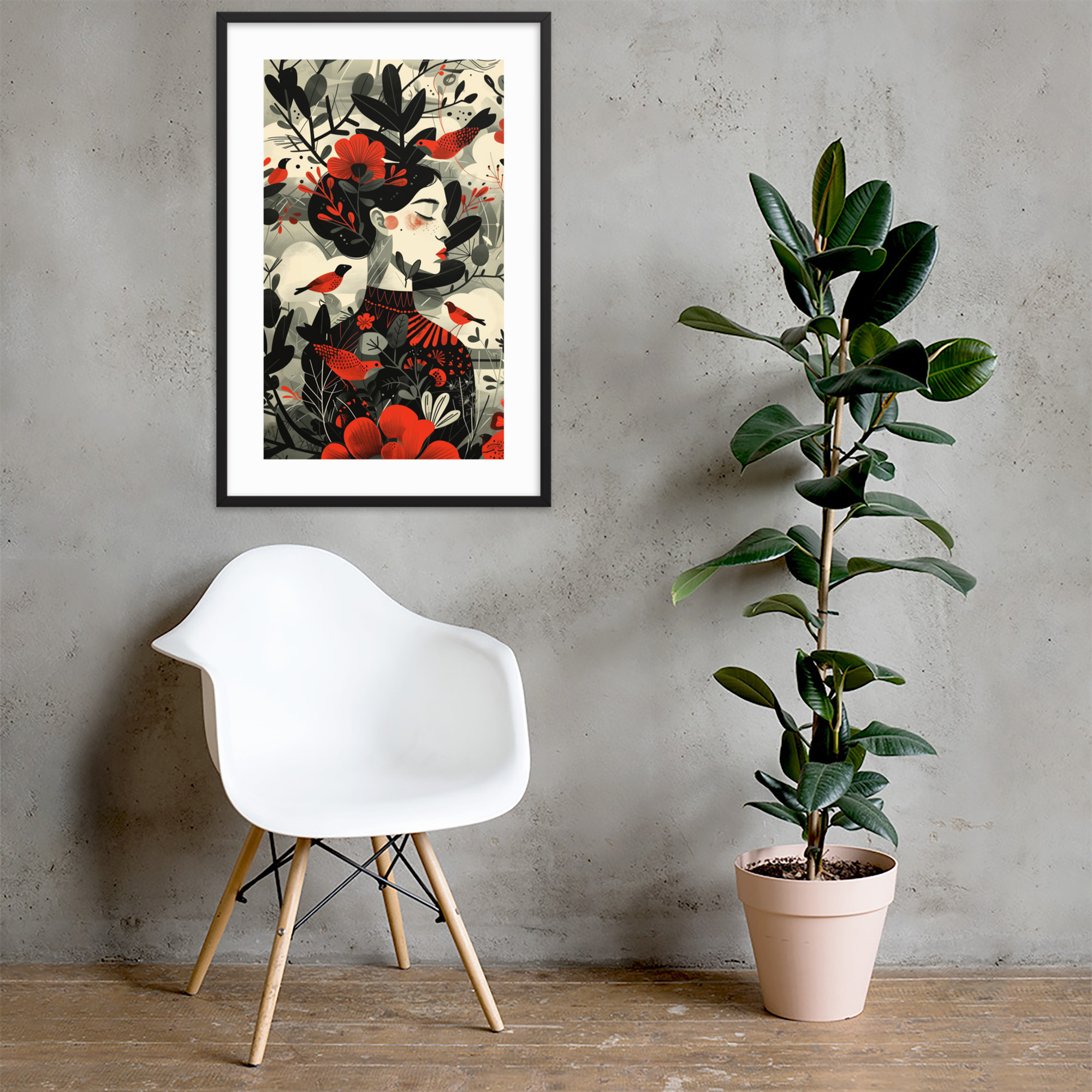 This enchanting piece captures the essence of nature with a beautifully stylized woman adorned by vibrant red flowers and whimsical birds. The minimalist frame and muted background highlight the intricate design, making it a perfect addition to any living space. Enhance your decor with this unique artwork that brings a touch of nature indoors.