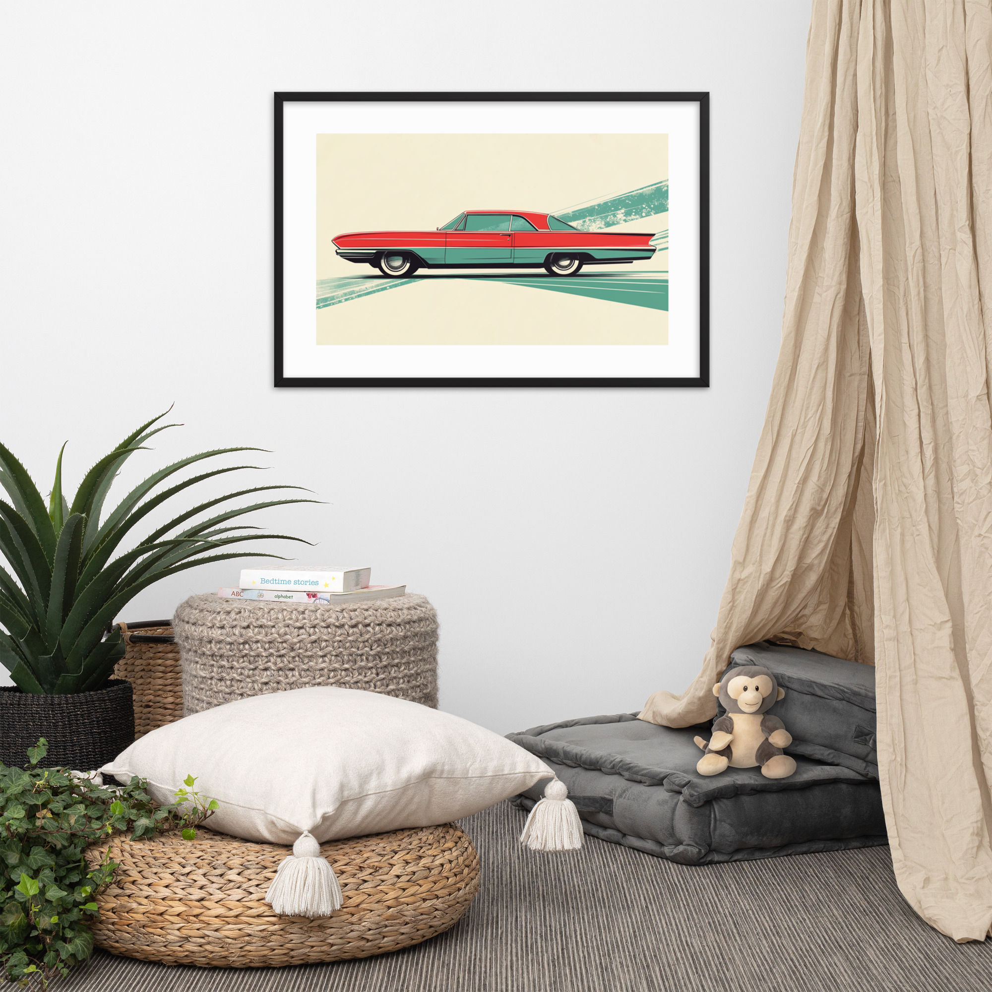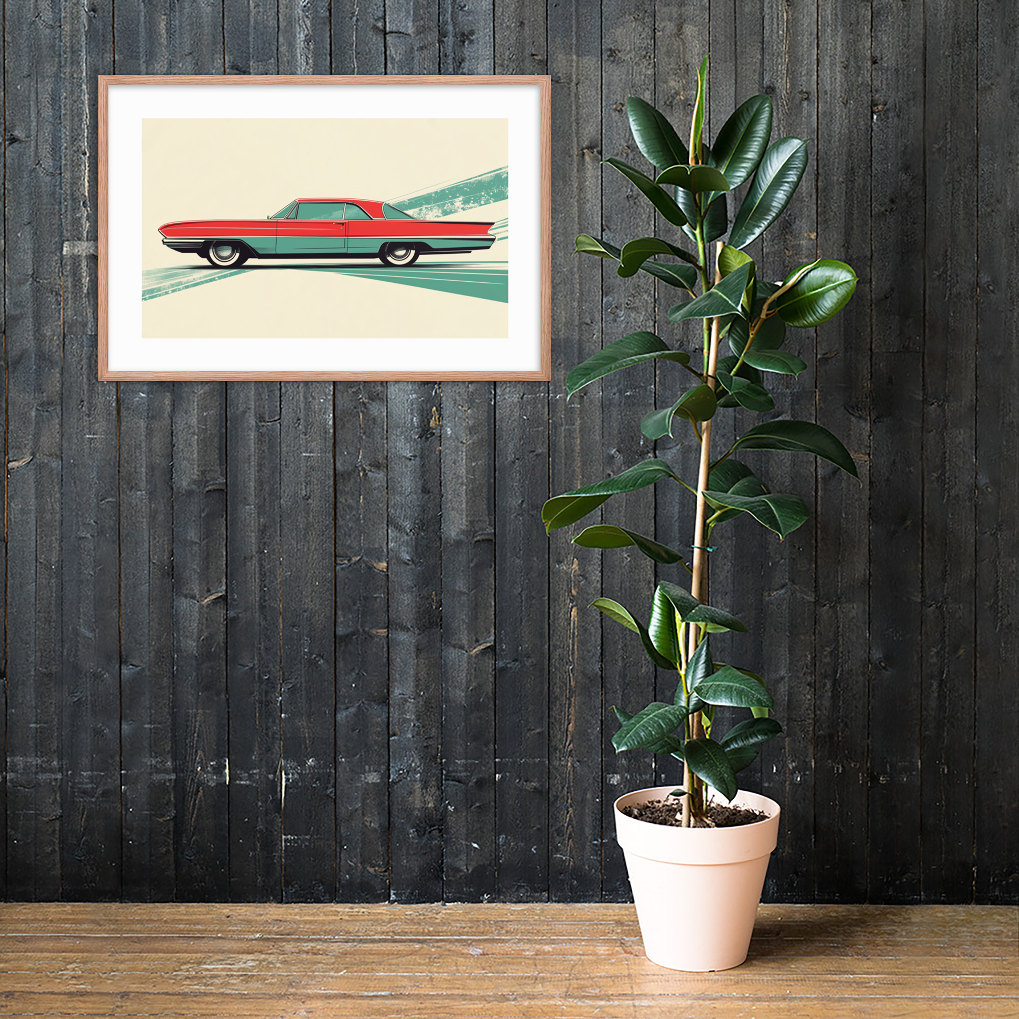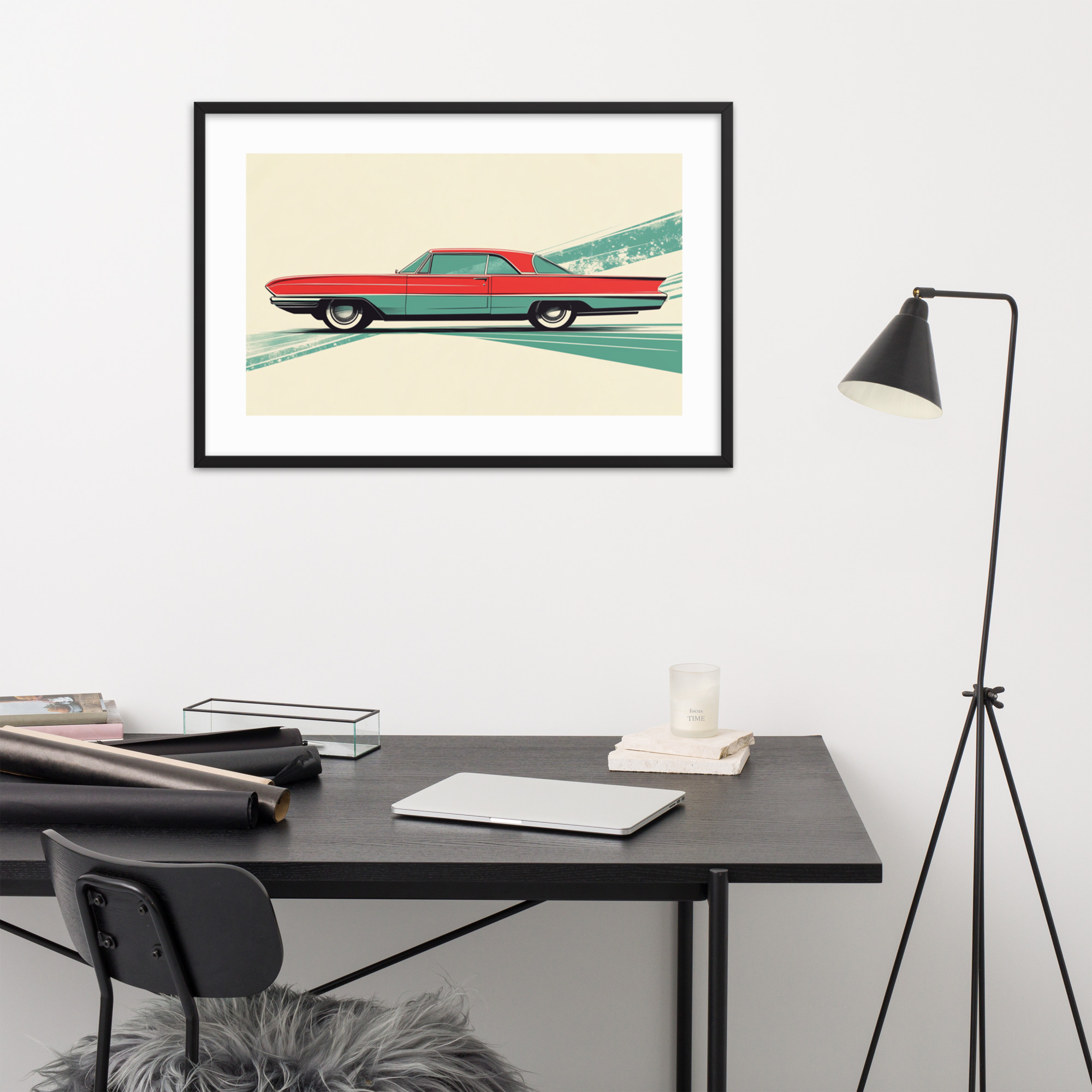 This red car print channels mid-century design with sleek lines and vibrant colors. Perfect for car enthusiasts and vintage decor lovers, this framed artwork makes a stylish addition to offices, living rooms, and garages. It brings a nostalgic feel to any space.