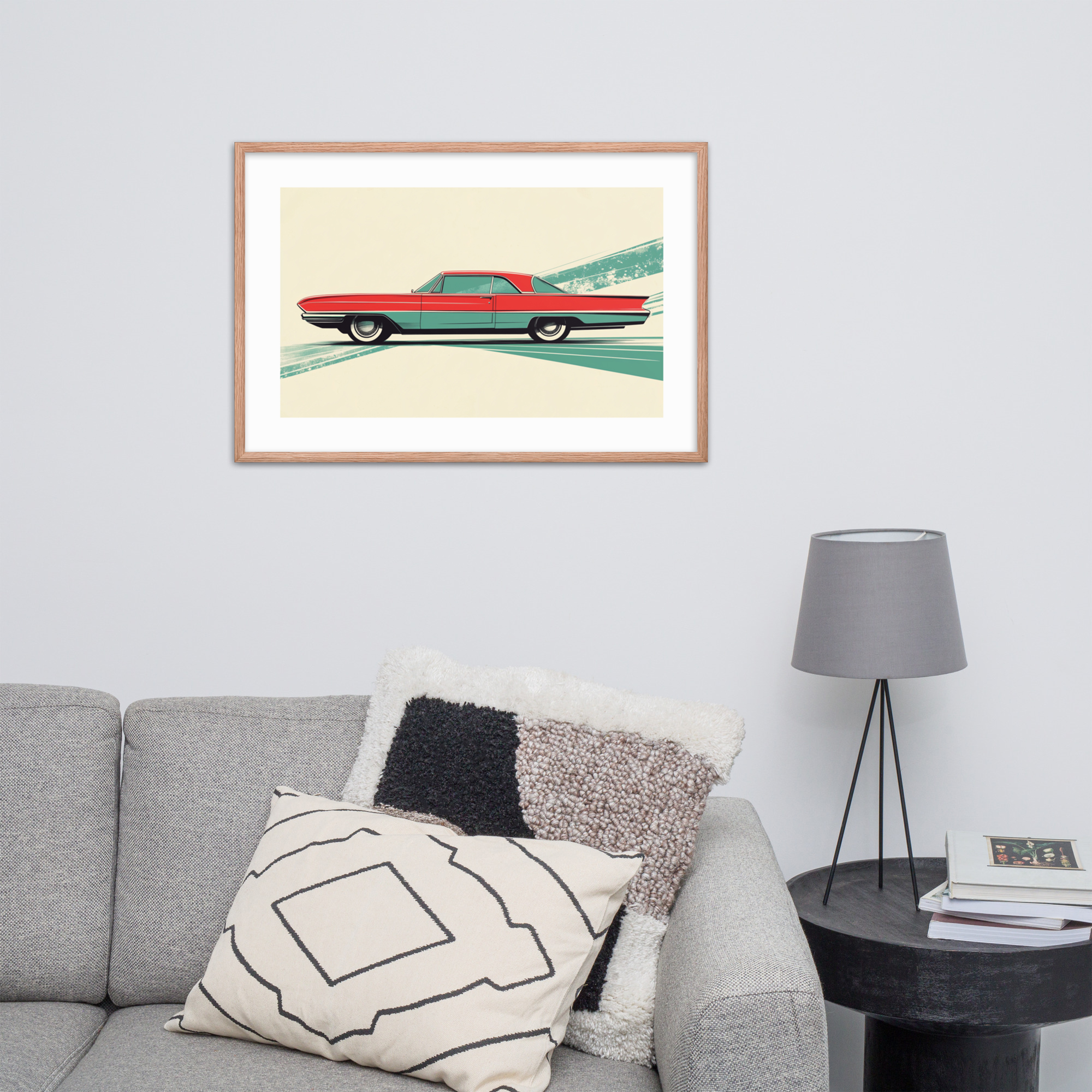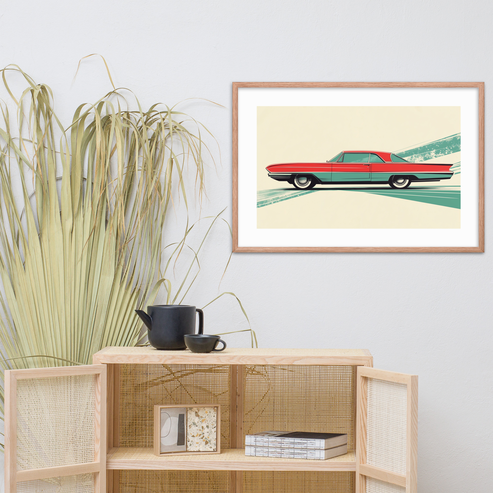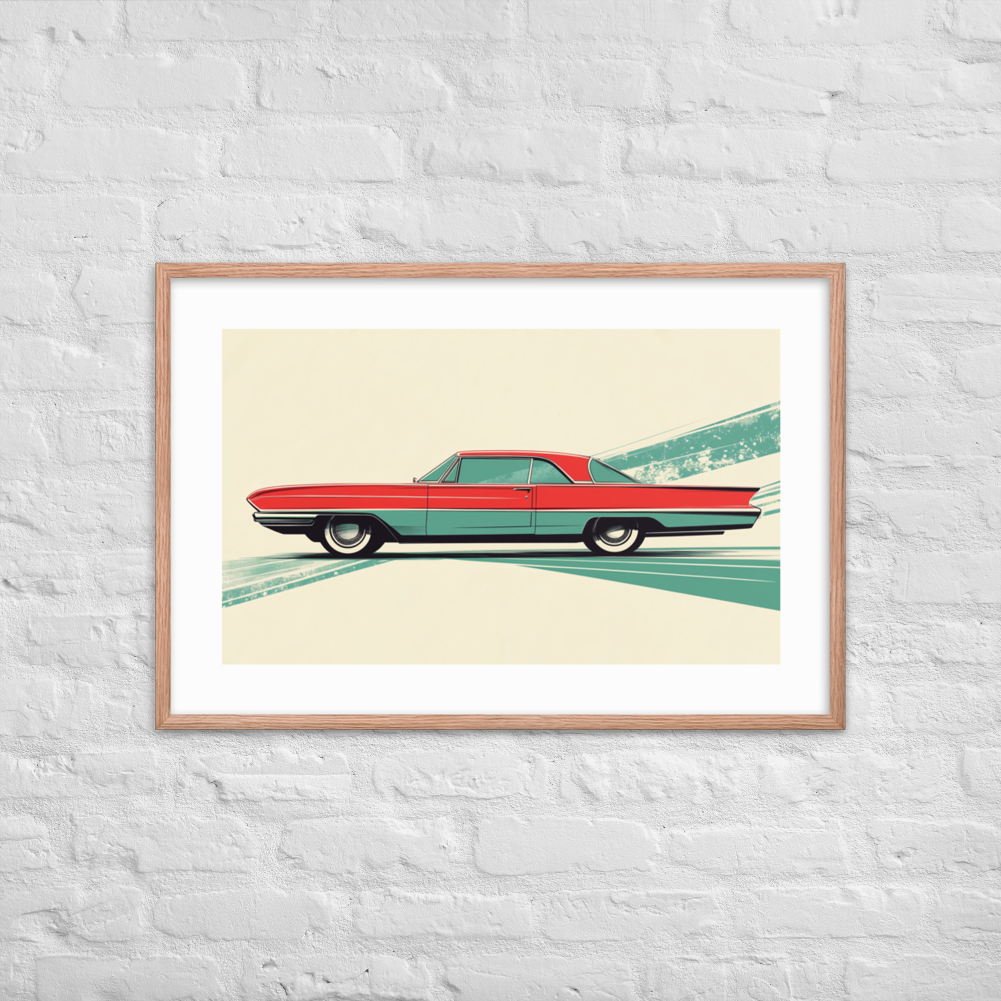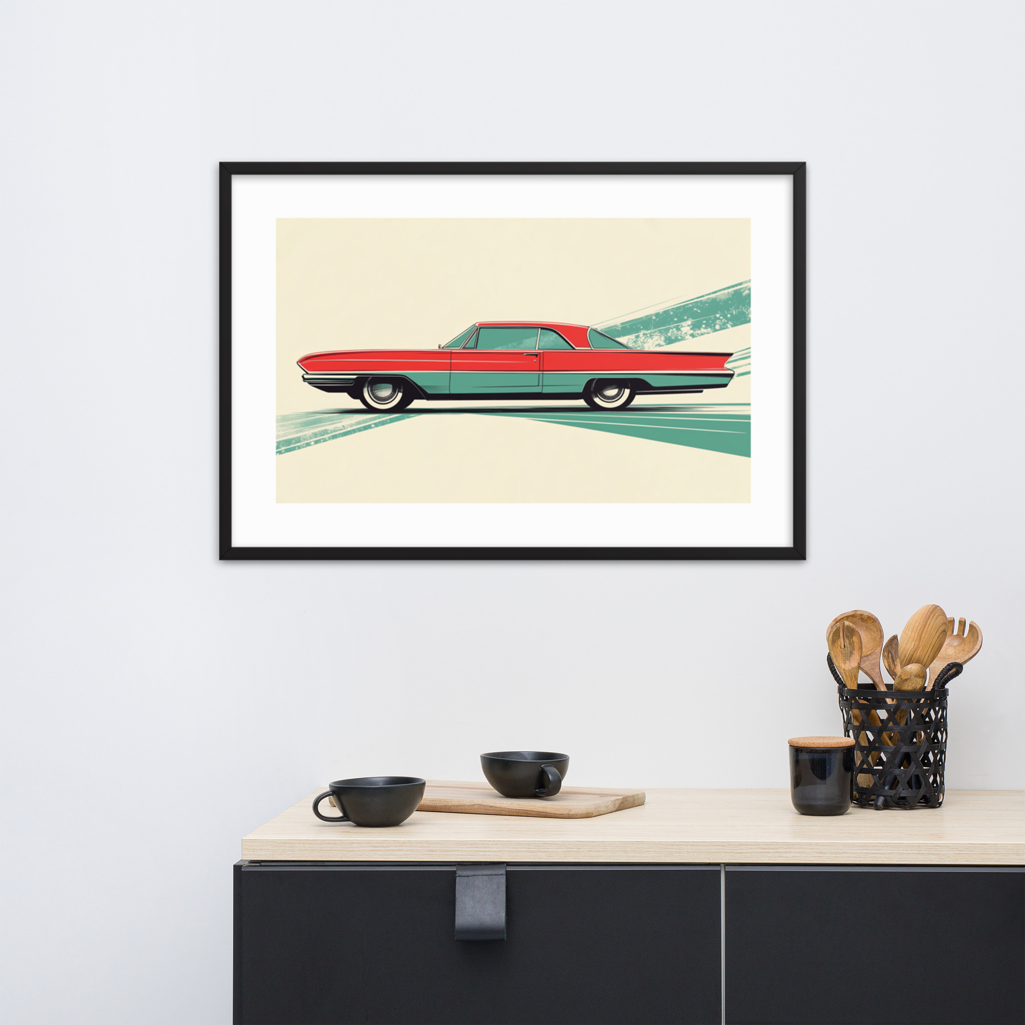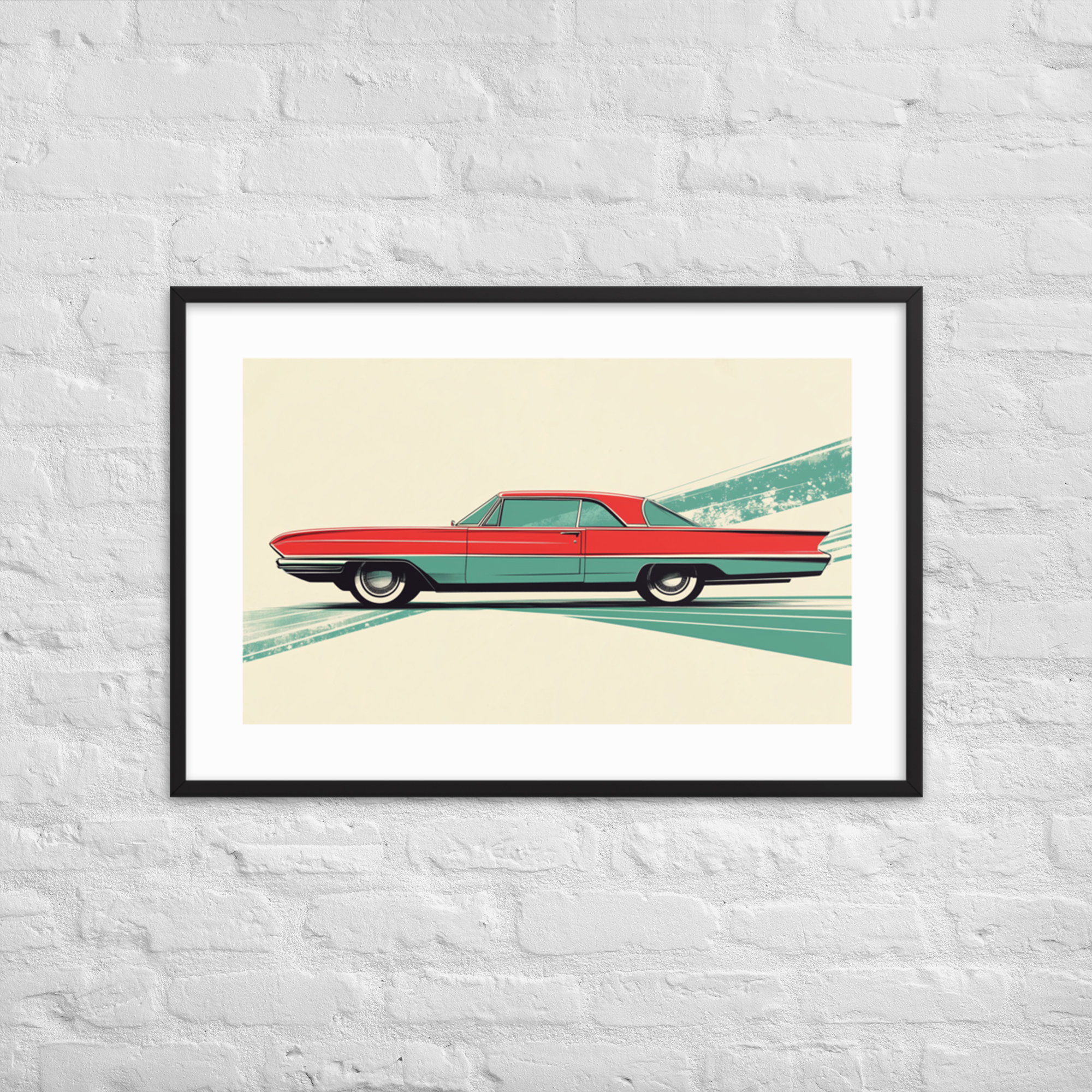 Celebrate the charm of mid-century automotive design with this striking red car print. Perfect for adding a touch of vintage flair to any room, it features clean lines and a unique geometric background in green. This artwork is framed in black, making it ready to hang and elevate your space with its timeless appeal.