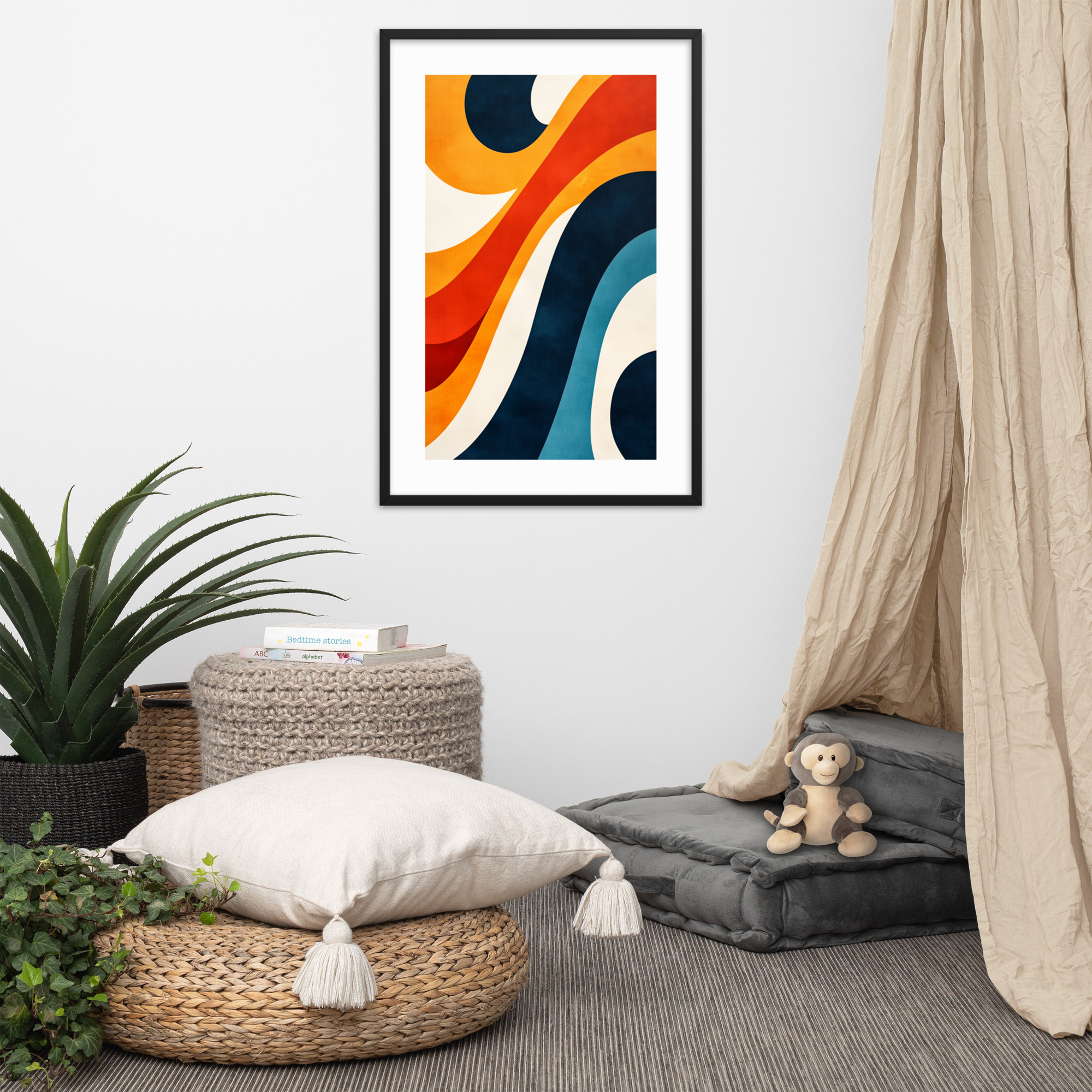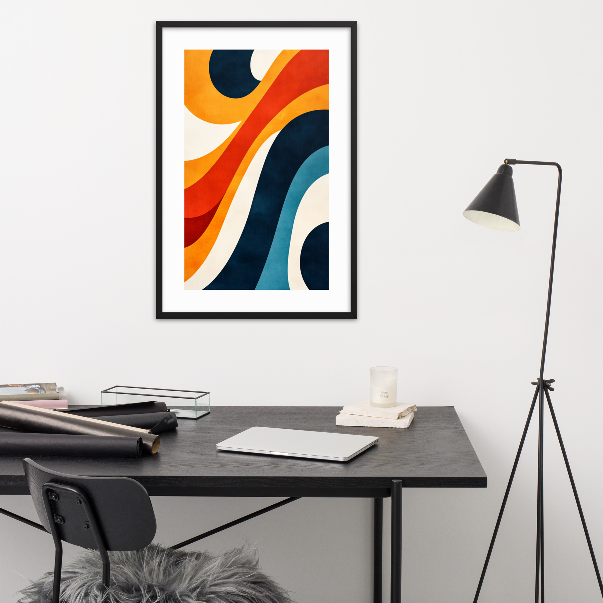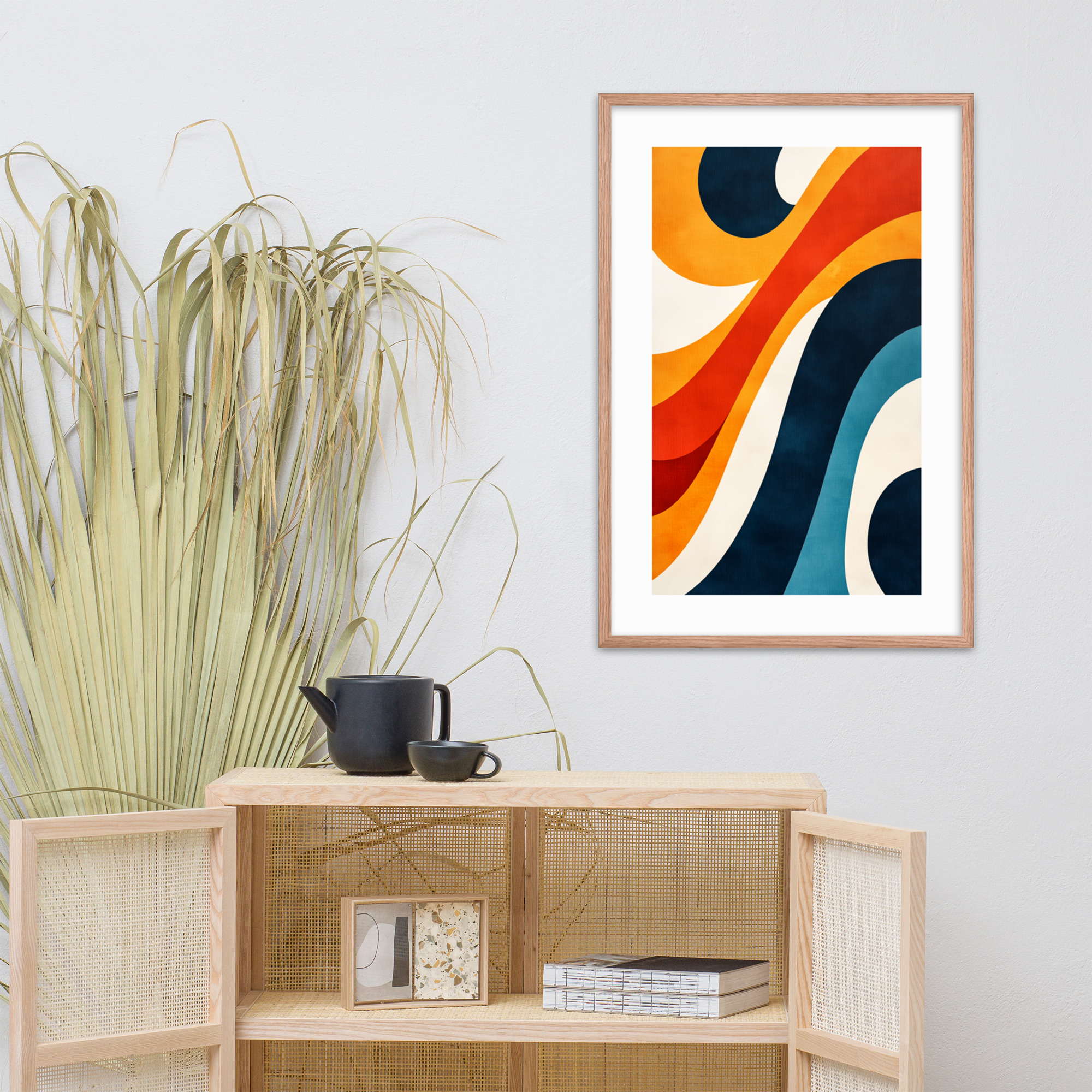 This abstract art print features dynamic waves and curves in bold colors, making it a perfect addition to modern and mid-century decor. Ideal for living rooms, offices, or bedrooms, it adds movement and charm to any space.