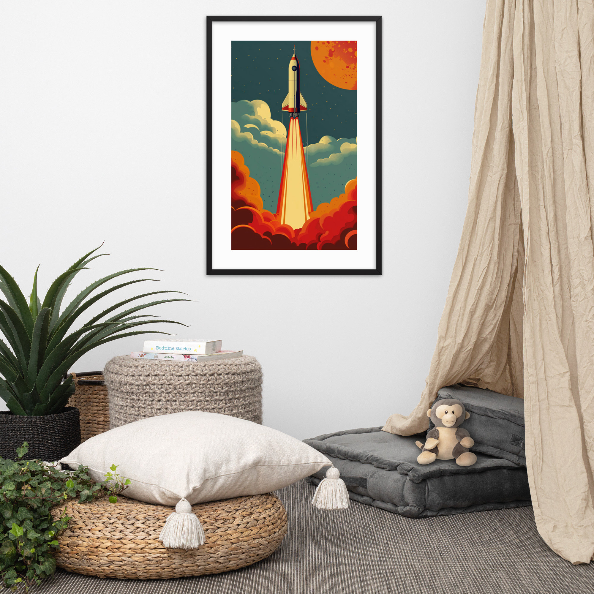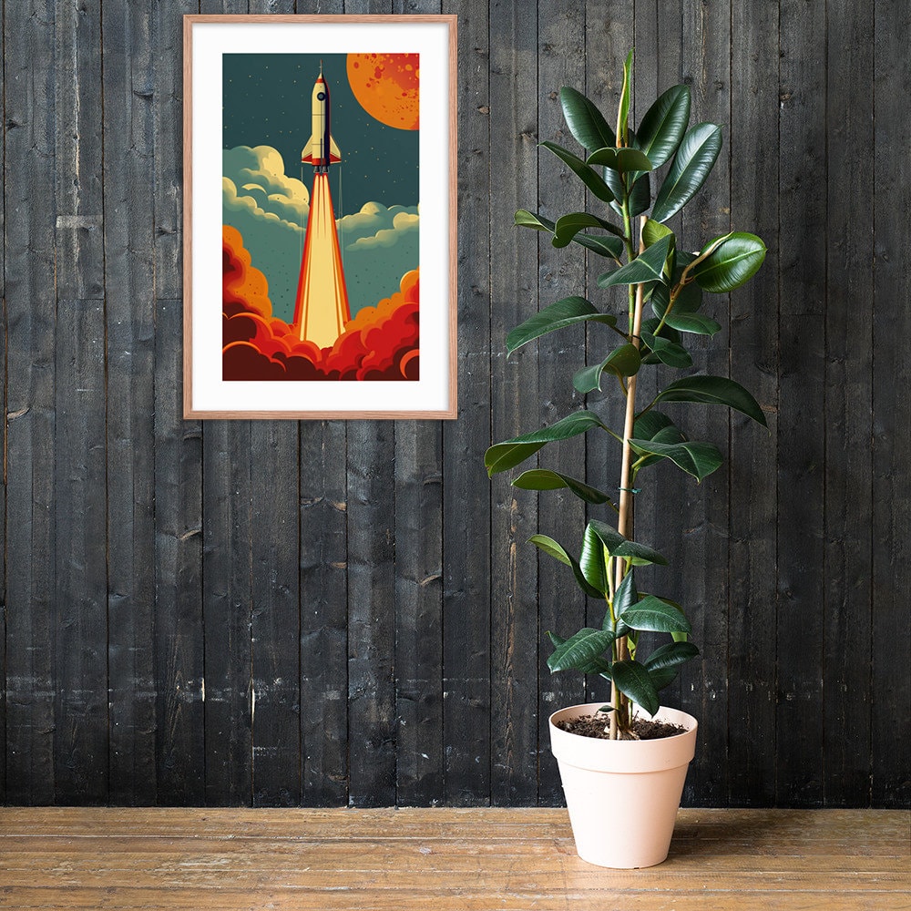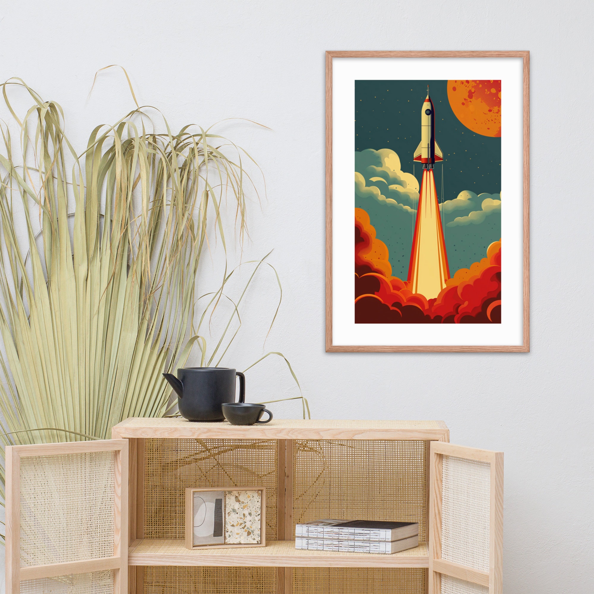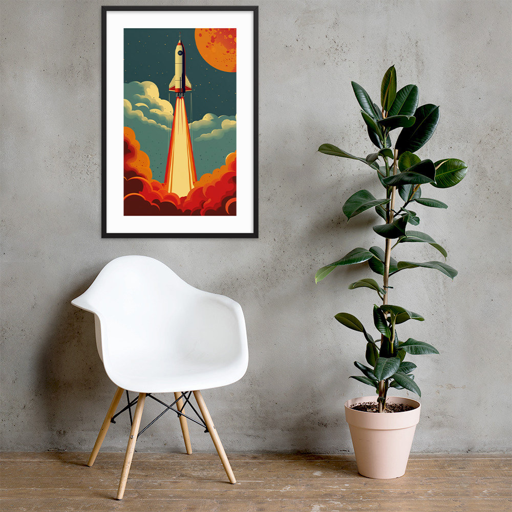 This retro rocket launch print features vibrant colors and sleek mid-century design, perfect for space enthusiasts. It adds dynamic energy to your decor, making it a great fit for game rooms, offices, and living areas.