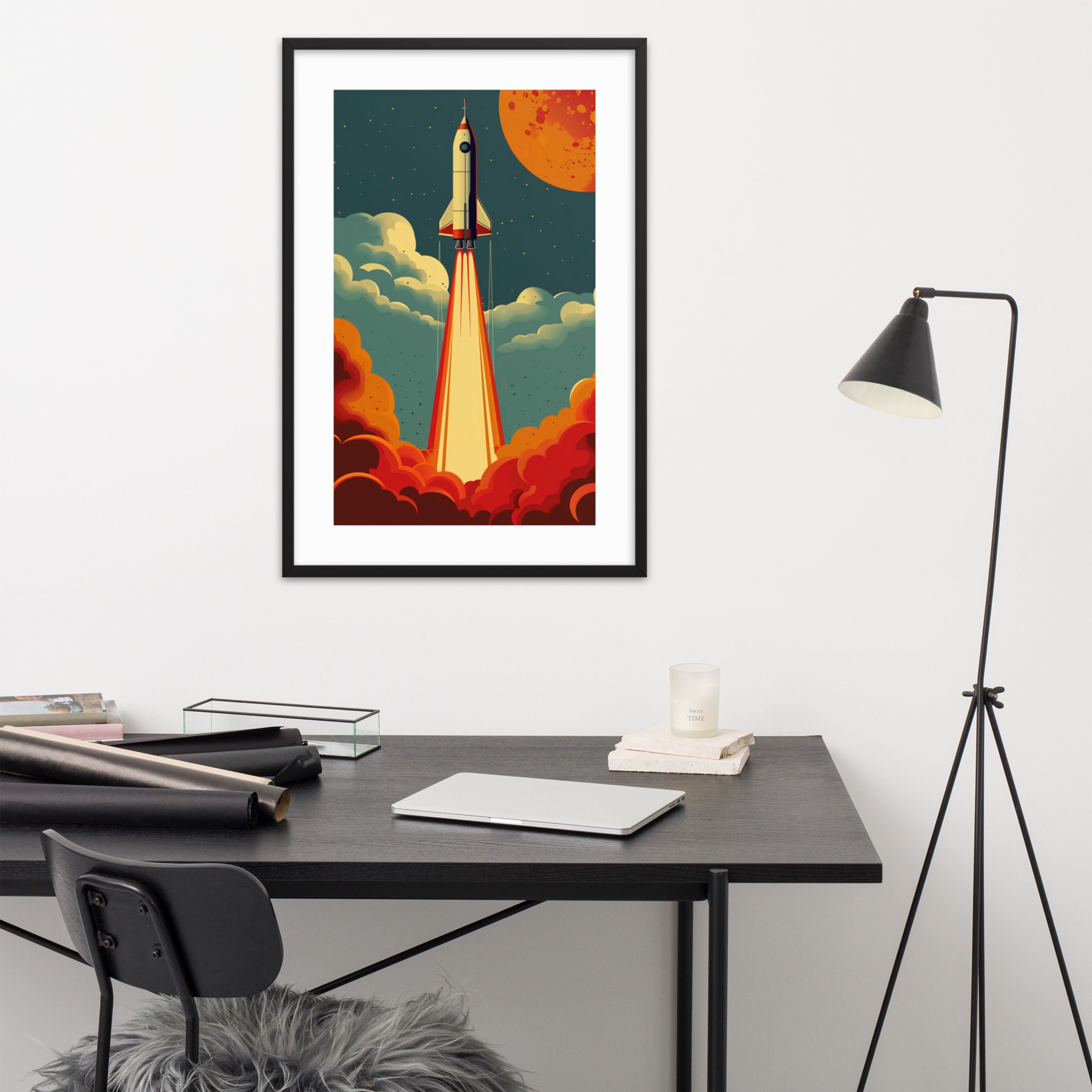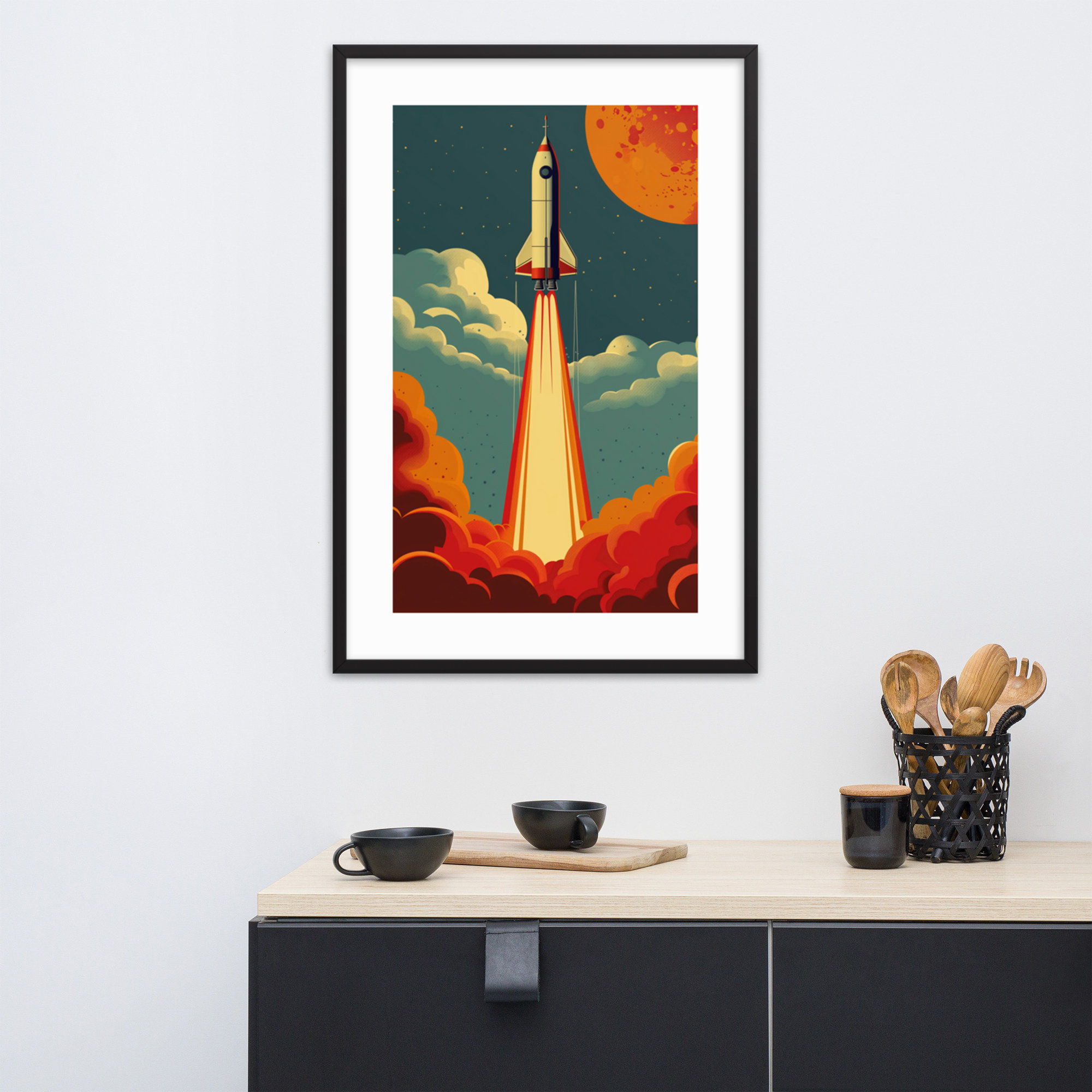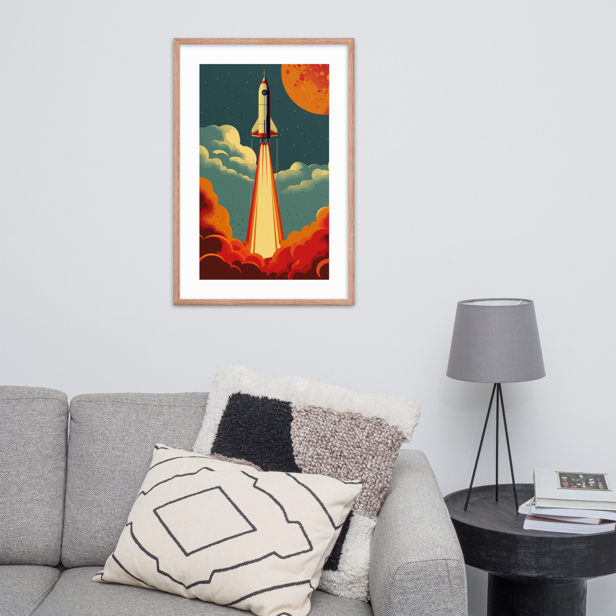 This retro rocket launch print features vibrant colors and sleek mid-century design, perfect for space enthusiasts. It adds dynamic energy to your decor, making it a great fit for game rooms, offices, and living areas.