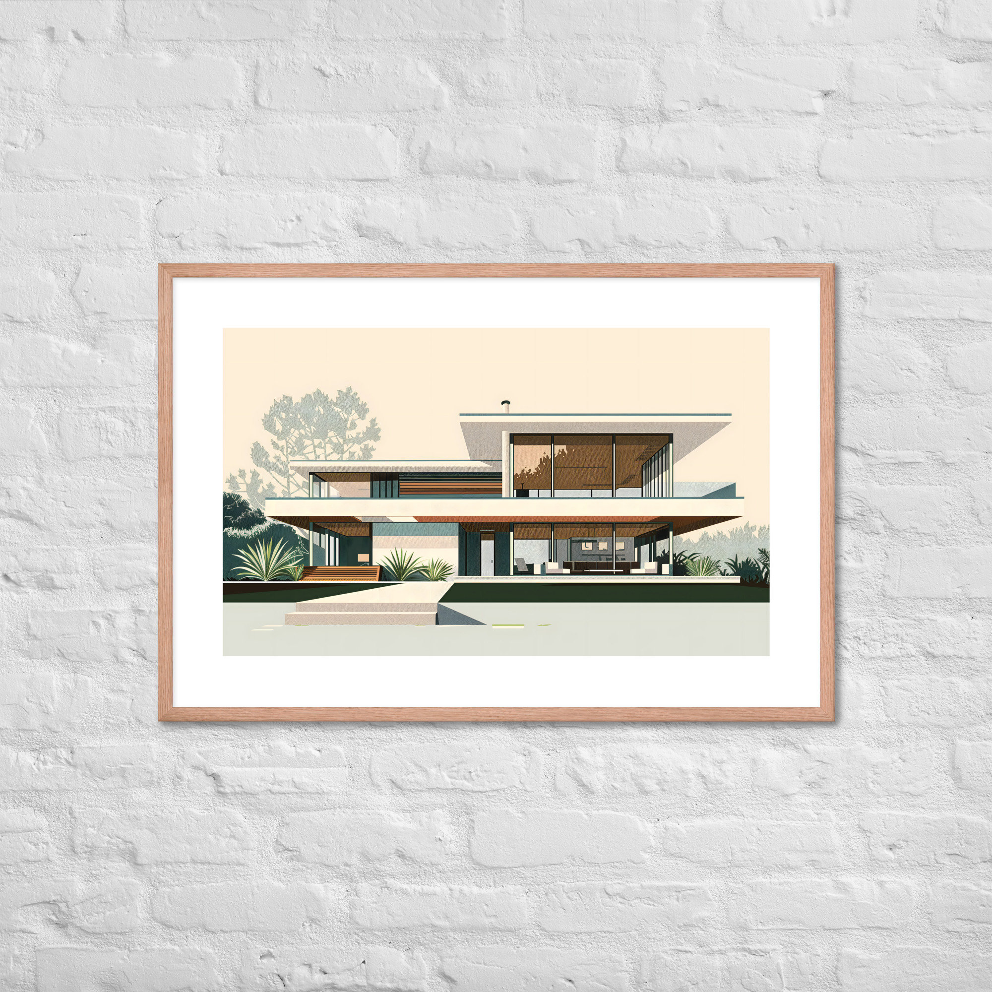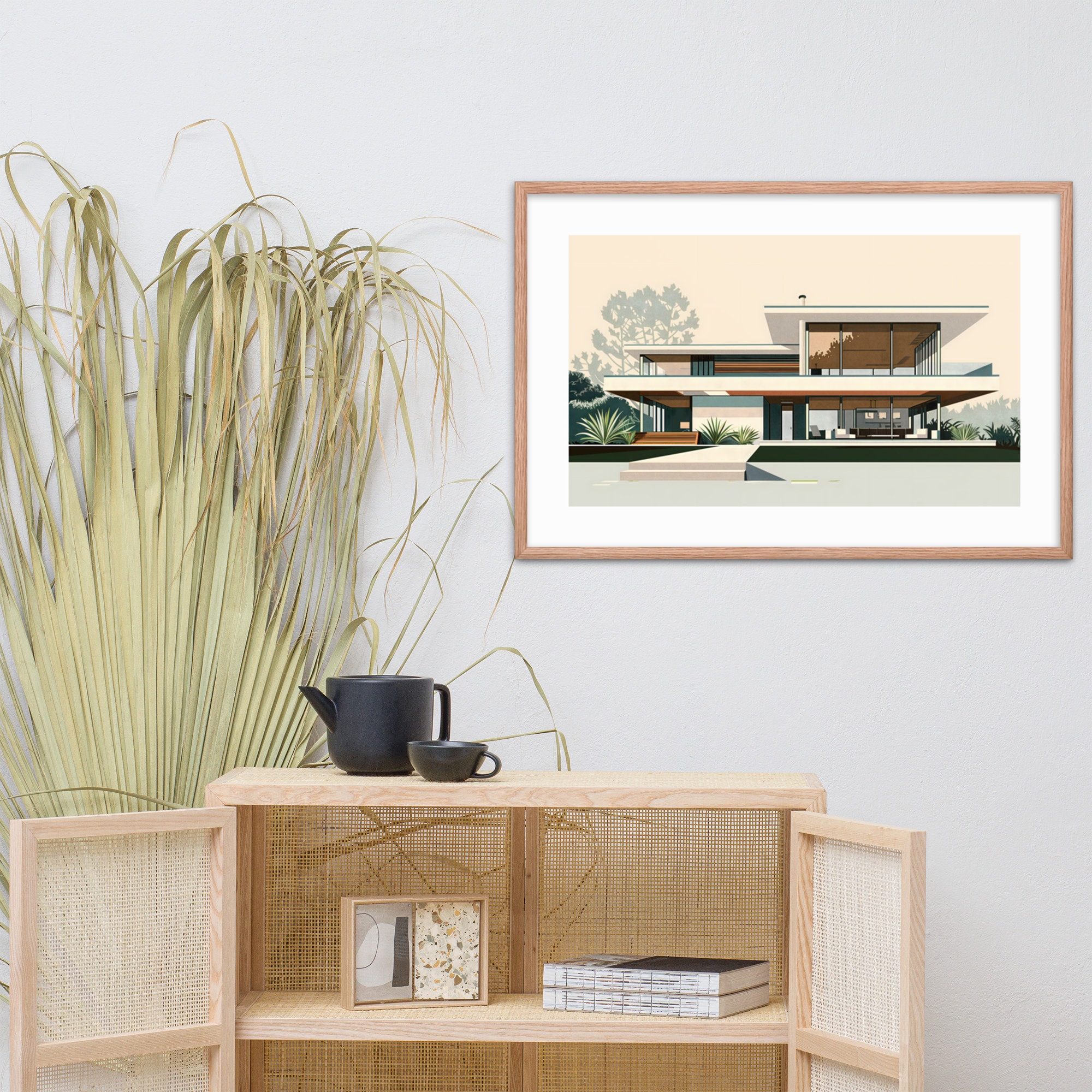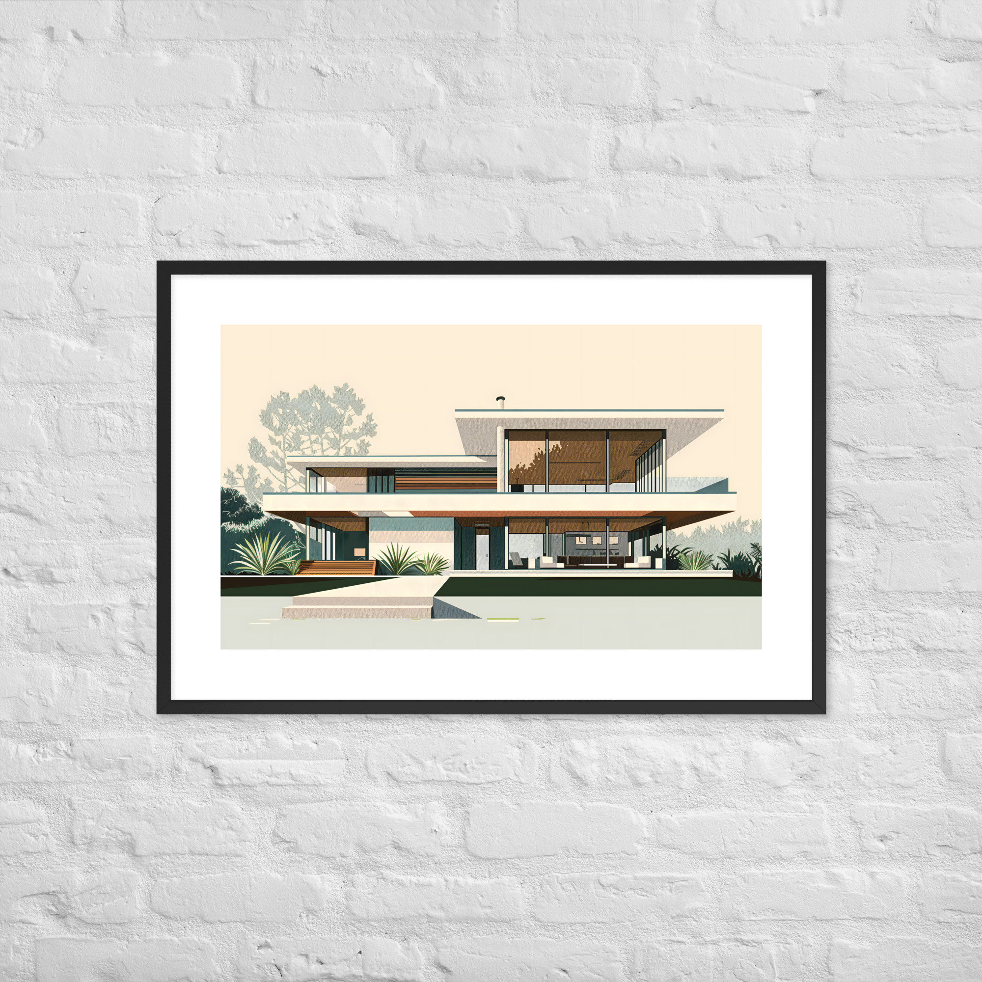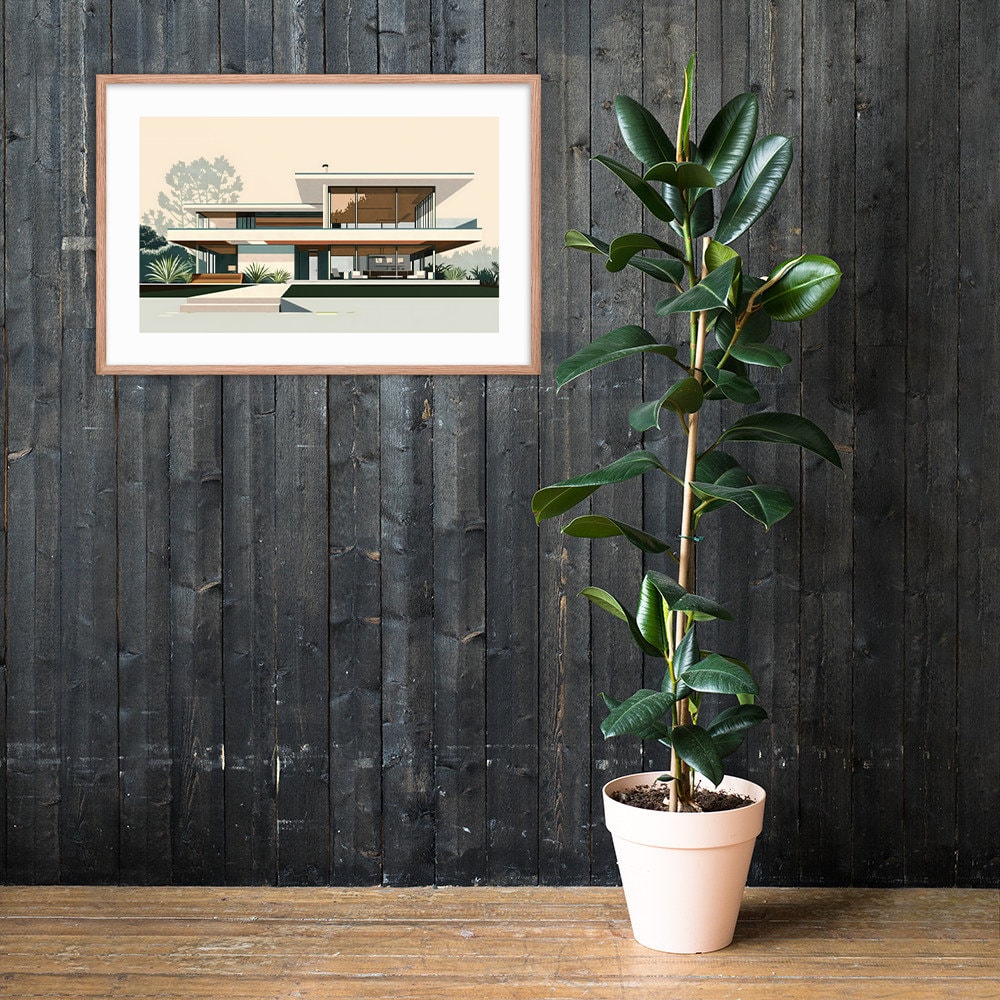 Elevate your space with this stunning architectural print. Showcasing clean lines, expansive windows, and seamless indoor-outdoor living, this retro-inspired artwork captures the essence of 1950s California cool. Perfect for MCM enthusiasts and design lovers alike.