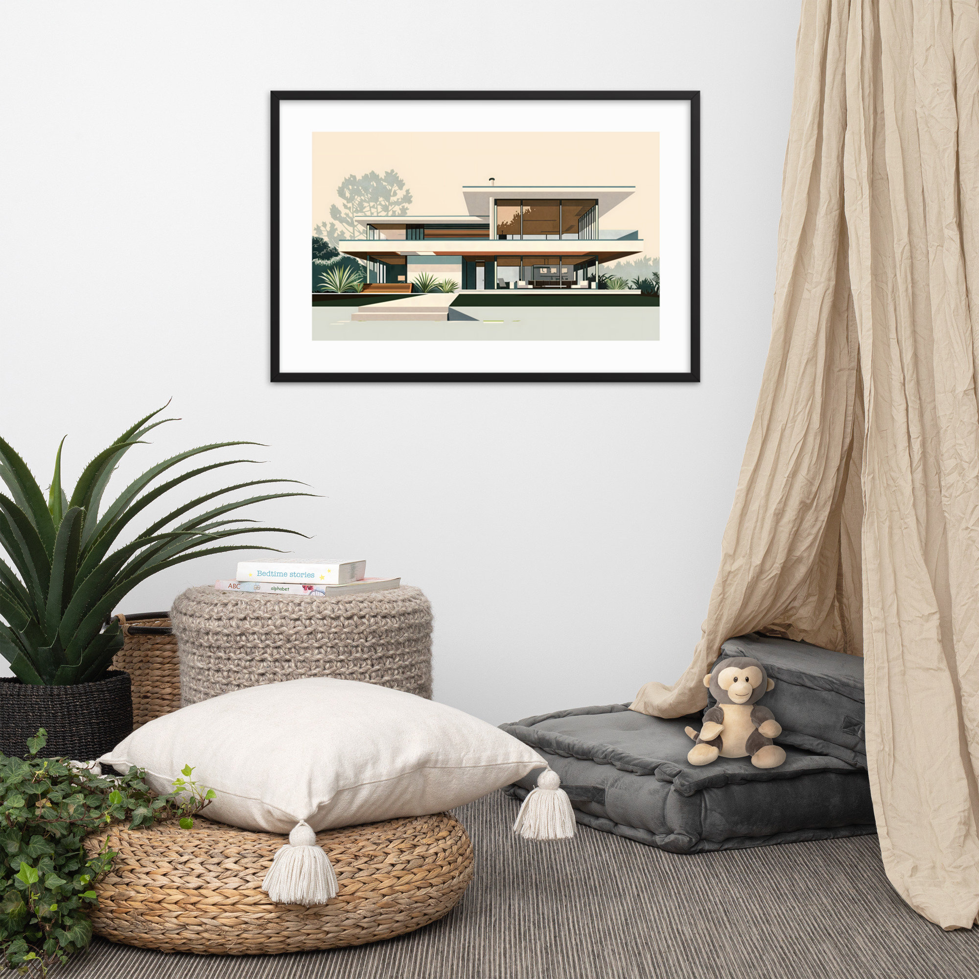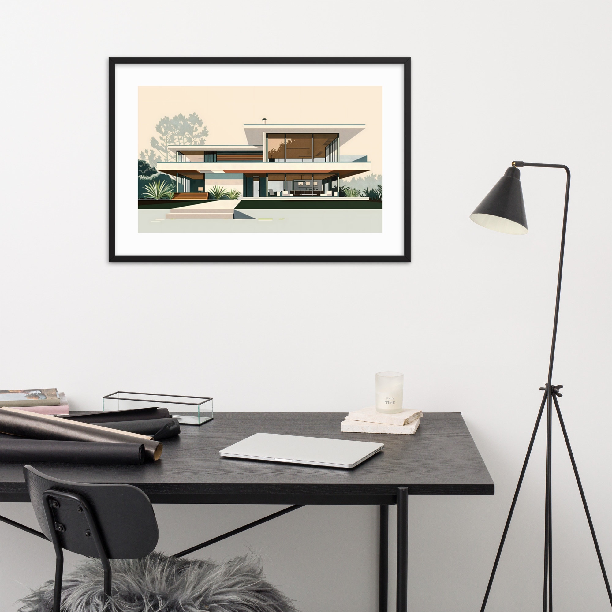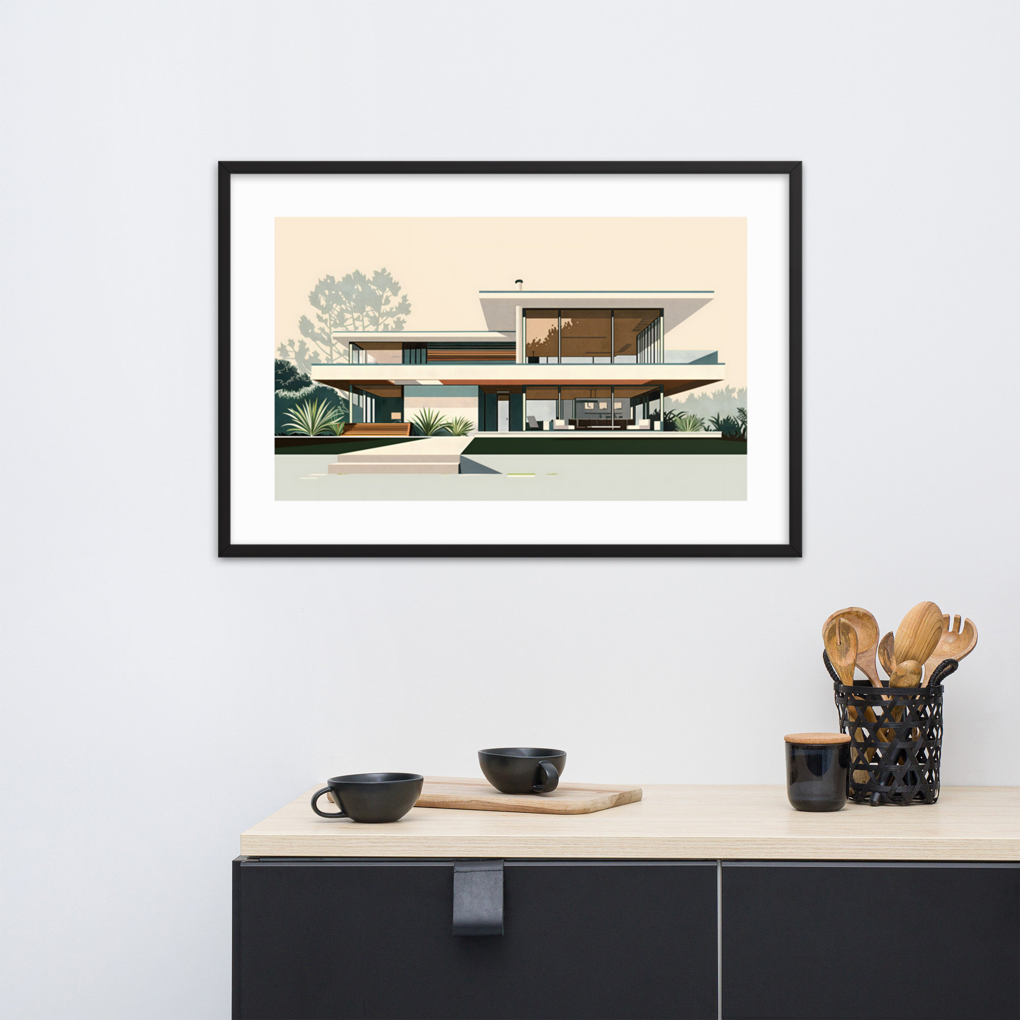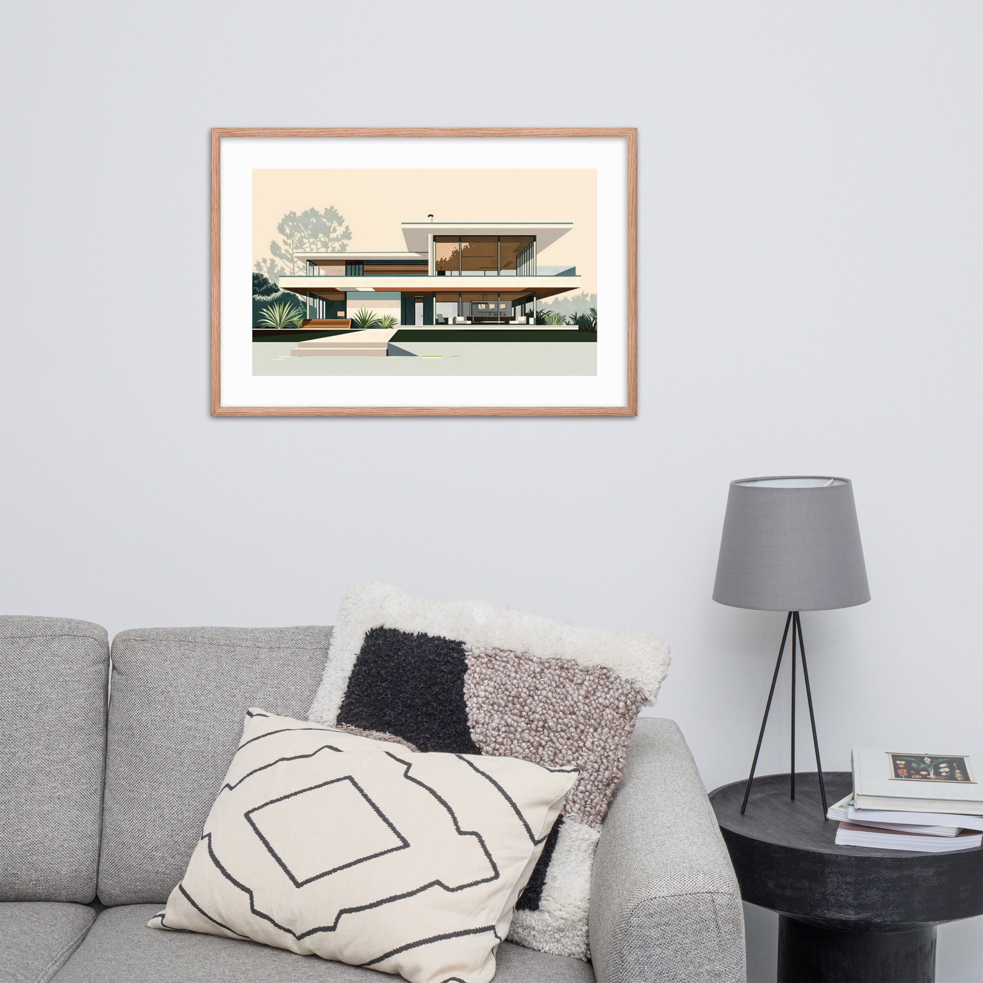 Elevate your space with this stunning architectural print. Showcasing clean lines, expansive windows, and seamless indoor-outdoor living, this retro-inspired artwork captures the essence of 1950s California cool. Perfect for MCM enthusiasts and design lovers alike.