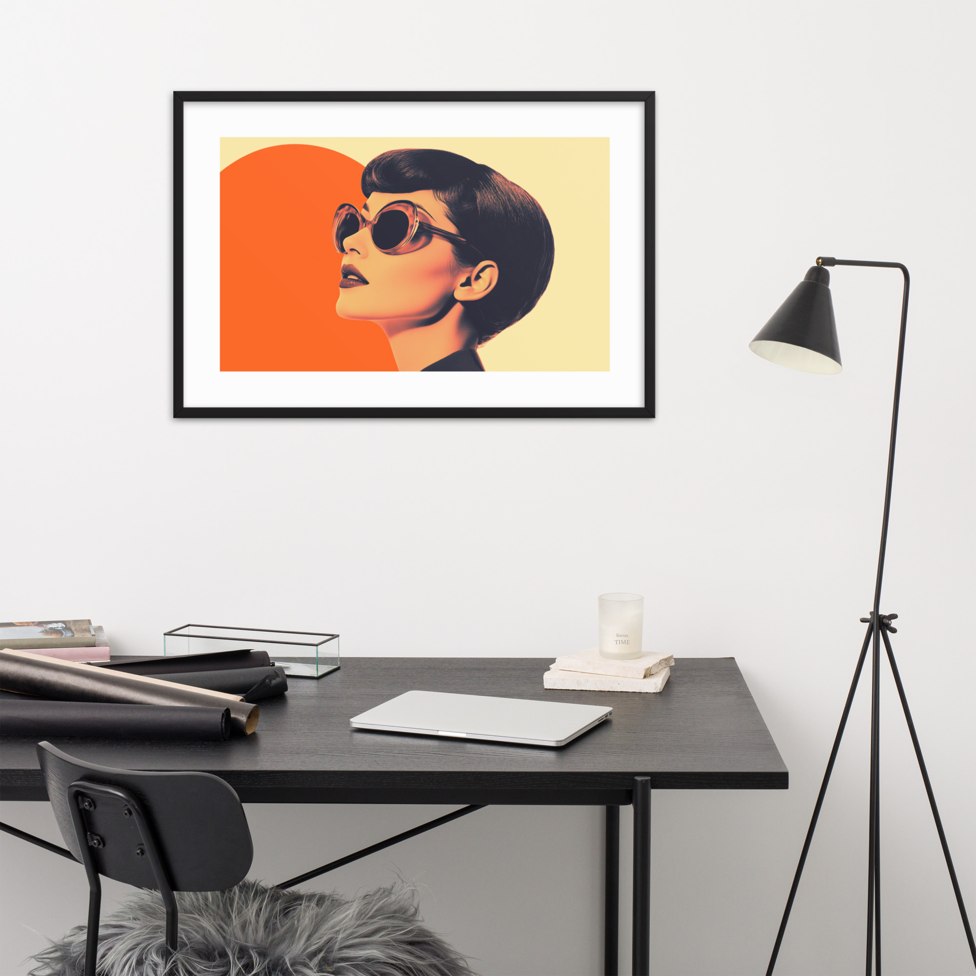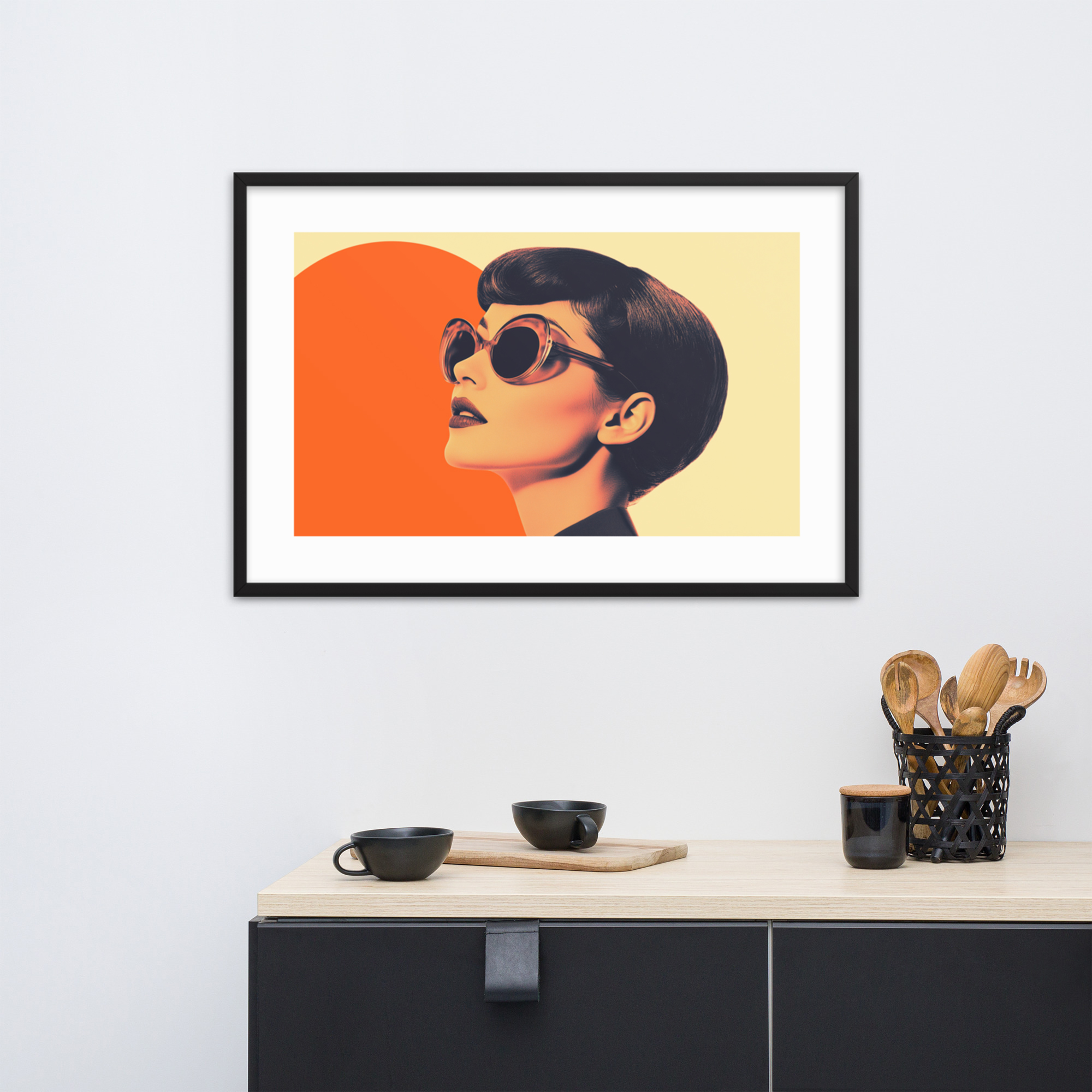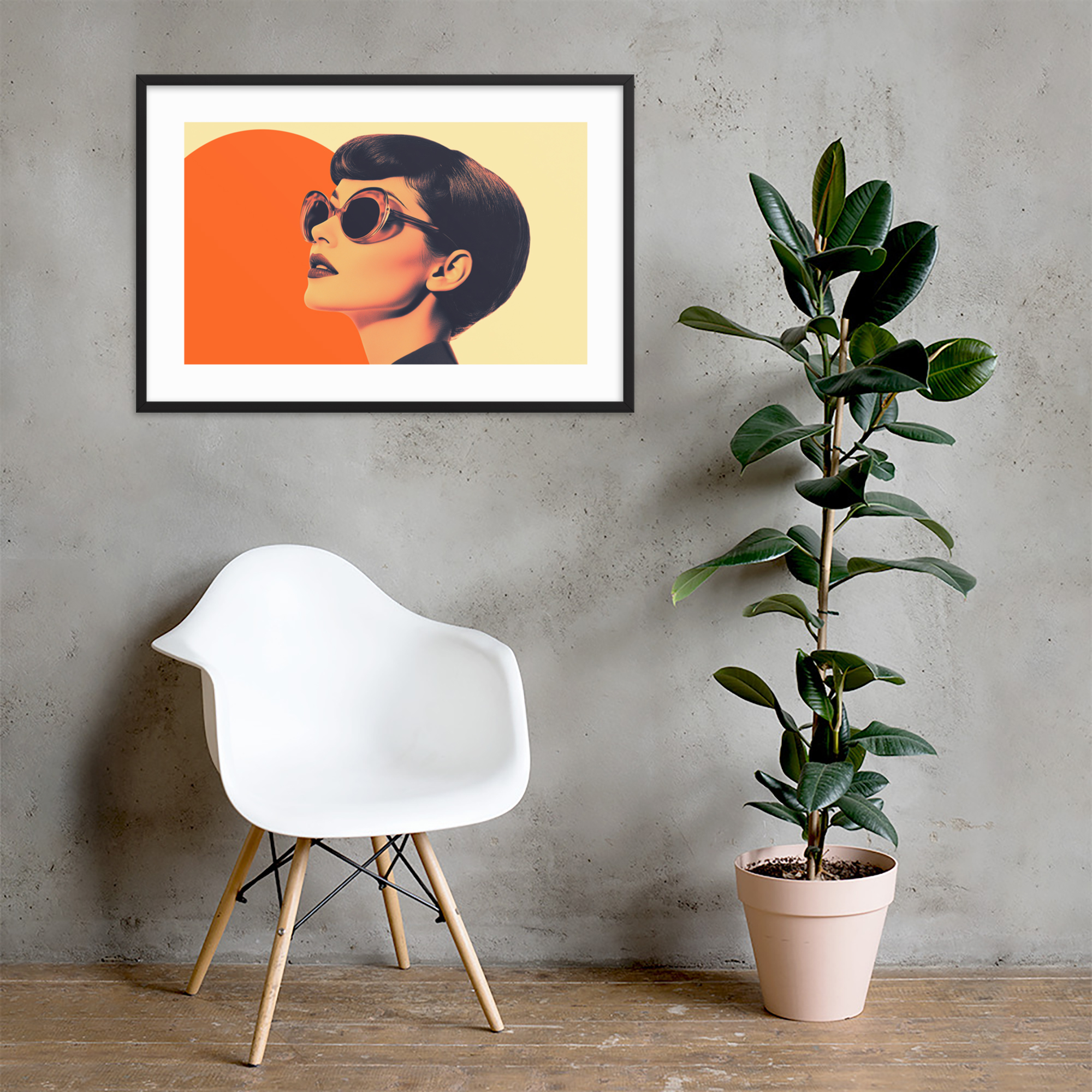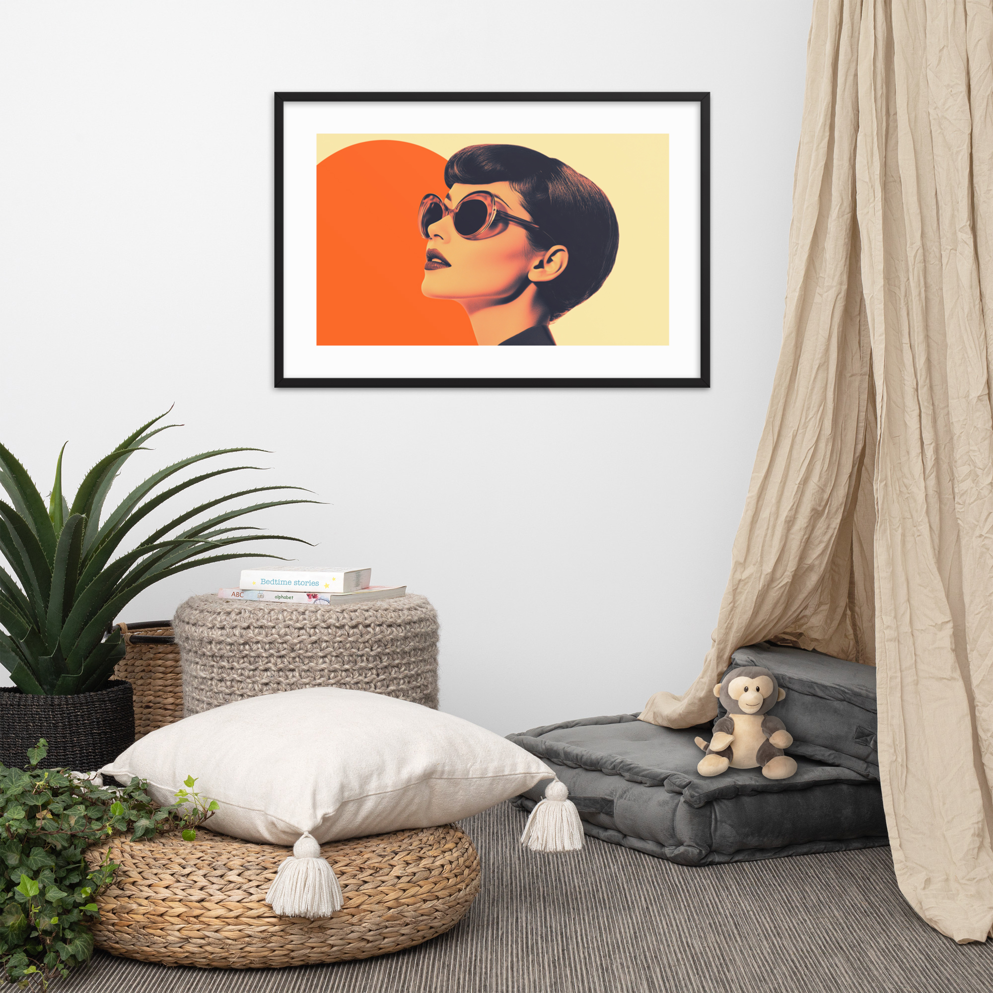 Embrace the vibrant colors and chic retro style of Sunset Starlet. This framed pop-art print captures a stylish woman in large sunglasses, set against a visually striking orange and yellow background. Perfect for adding a touch of vintage glamour to any room, this print is sure to make a statement!