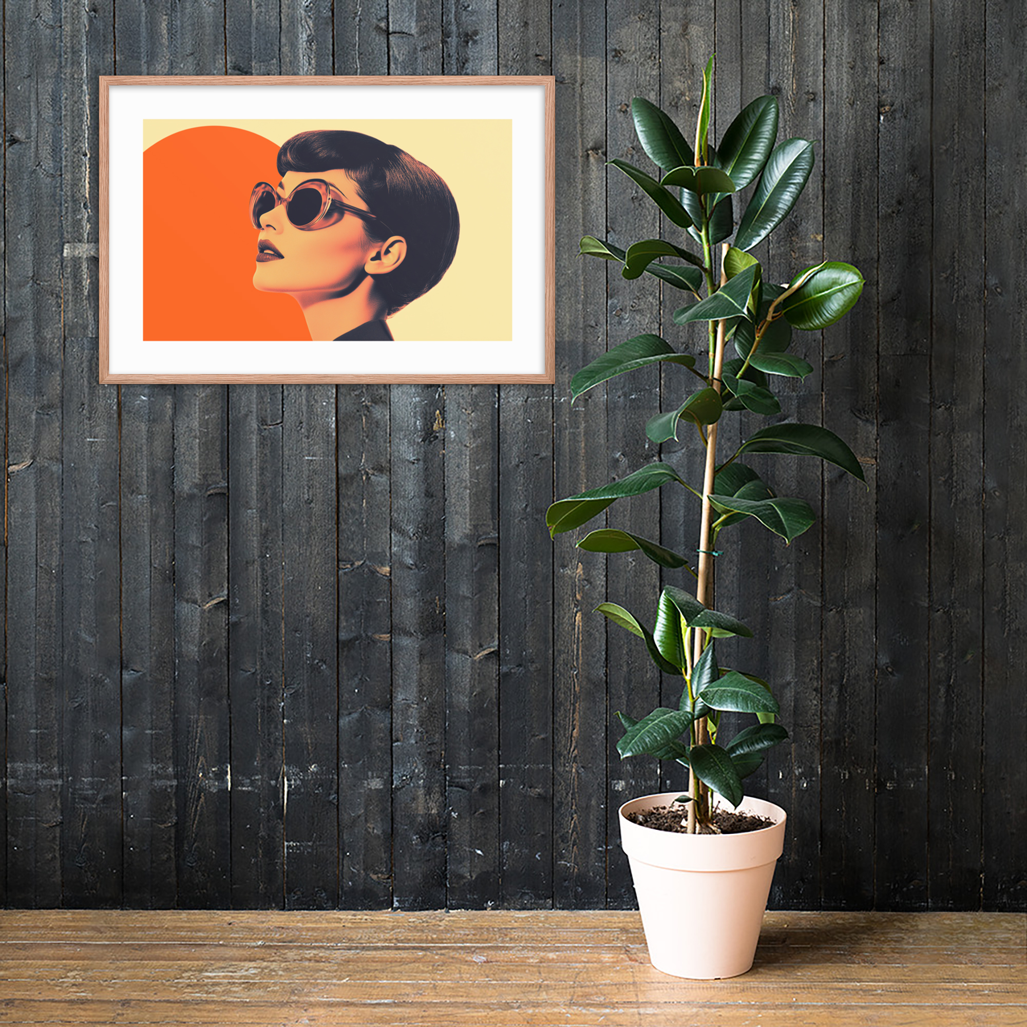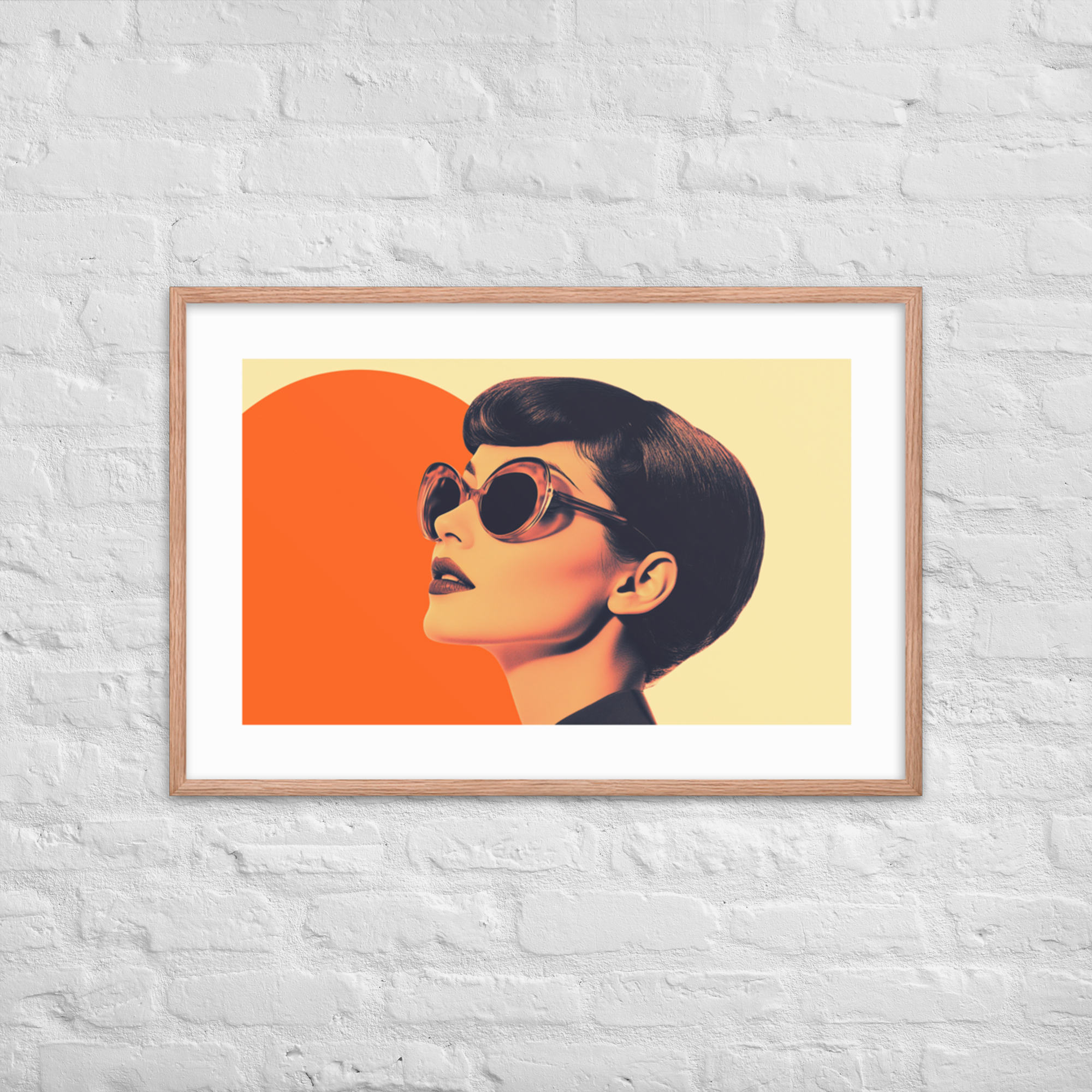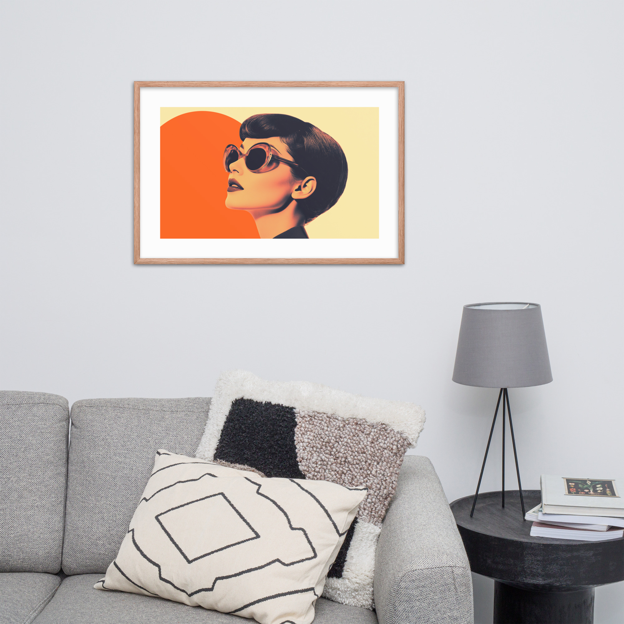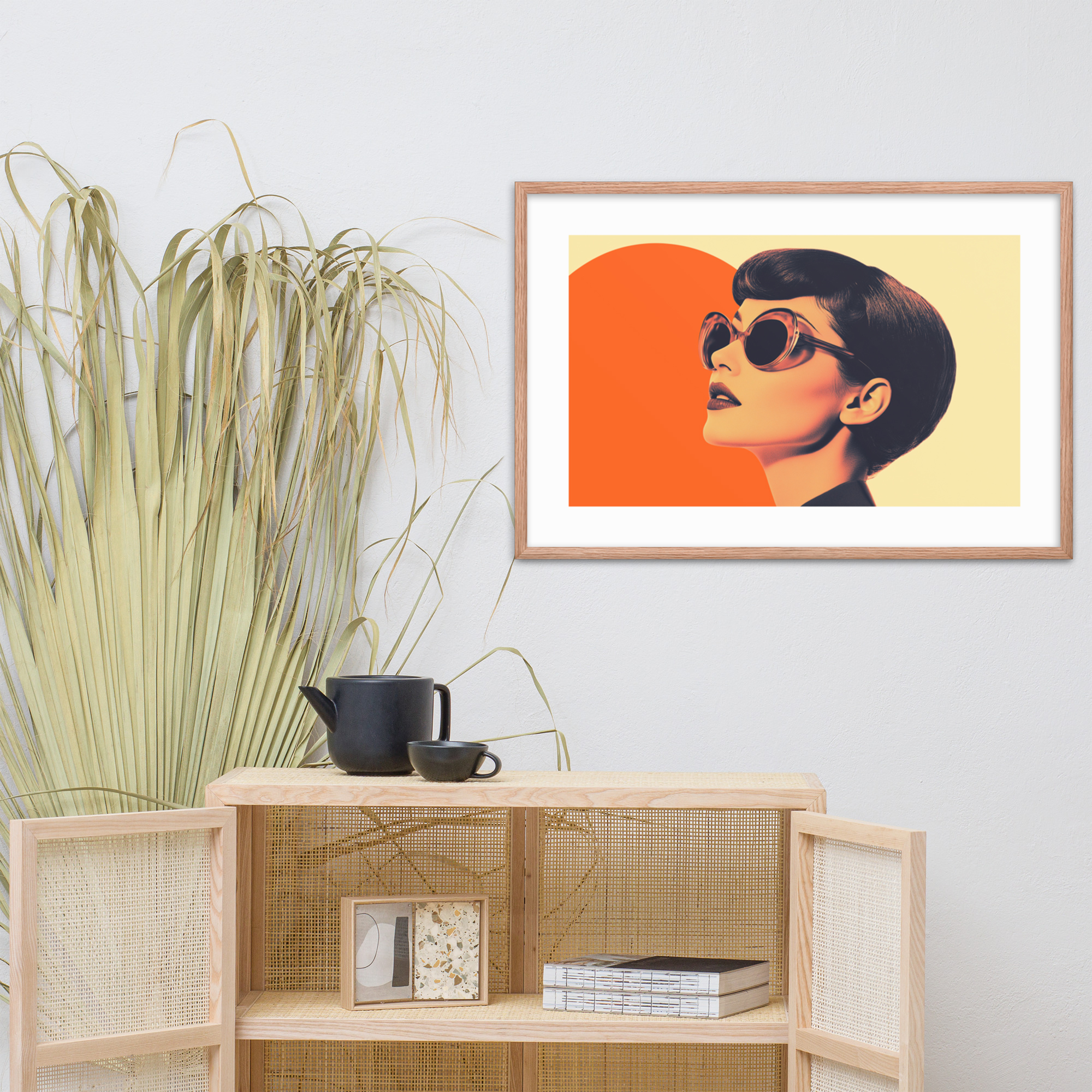 Embrace the vibrant colors and chic retro style of Sunset Starlet. This framed pop-art print captures a stylish woman in large sunglasses, set against a visually striking orange and yellow background. Perfect for adding a touch of vintage glamour to any room, this print is sure to make a statement!